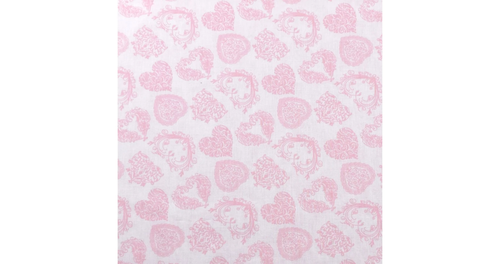 Pamutvászon méteráru fehér alapon világos rózsaszín színű indázó, a barokk stílusra emlékeztető szív mintával. Sokoldalúan felhasználható, közkedvelt természetes alapanyagú méteráru Oeko-tex minősítéssel. Kiváló ruházati termékek, konyhai, illetve egyéb lakásdekorációs textíliák varrásához és számos kézműves termék is készül belőle. Természetes anyag révén felhasználás előtt érdemes beavatni, mivel a textil az első mosáskor 8-10%-ot zsugorodhat.
