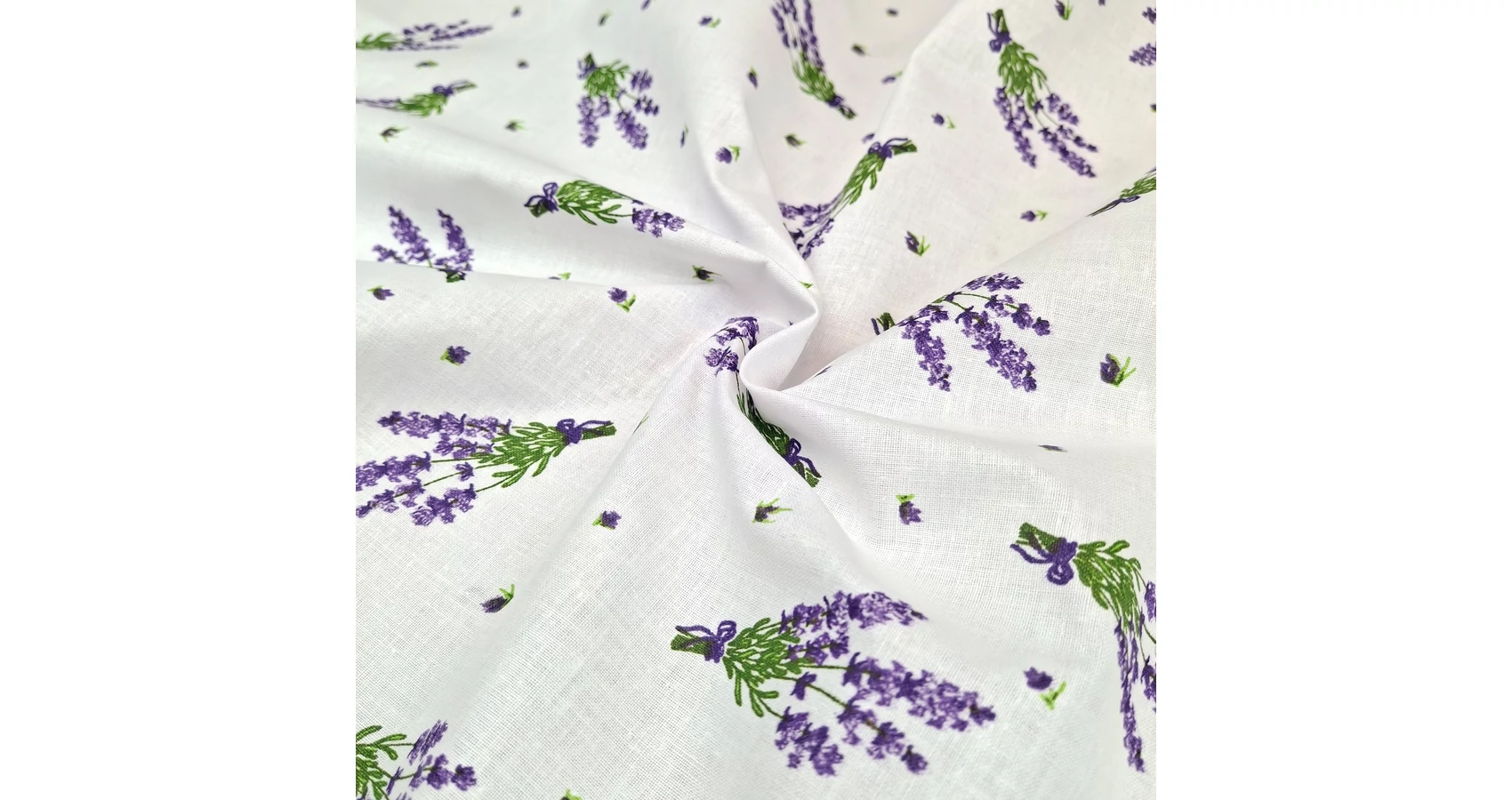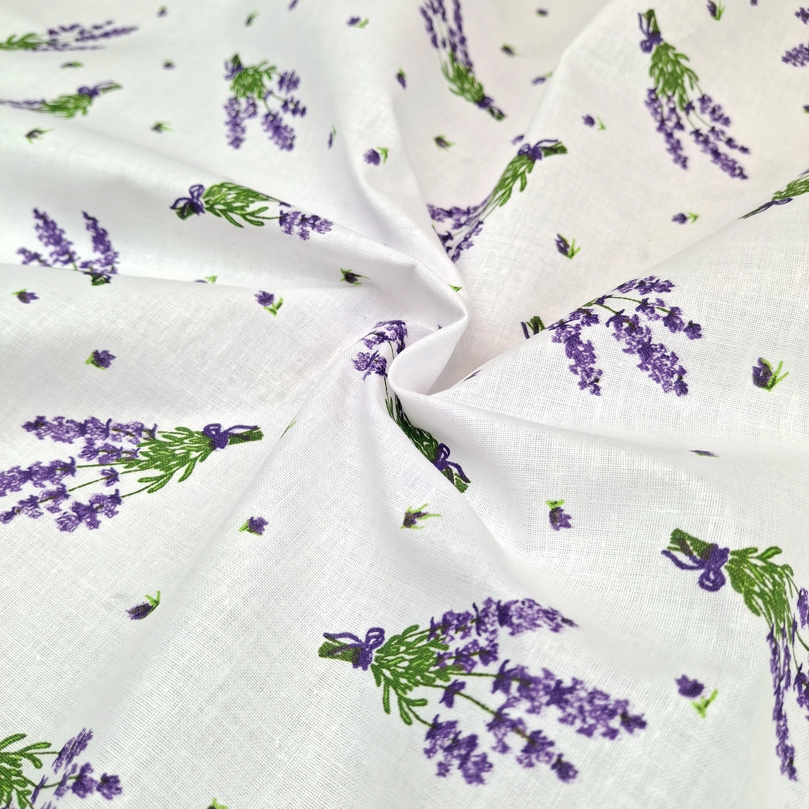 Pamutvászon méteráru fehér alapon csokros levendula mintával. Méteráruként tartása viszonylag merev, de mosás során tapintása jelentősen puhul. Kiváló alapanyag ruházati termékek, konyhai, illetve egyéb lakásdekorációs textíliák varrásához, de számos kézműves termék is készül belőle.