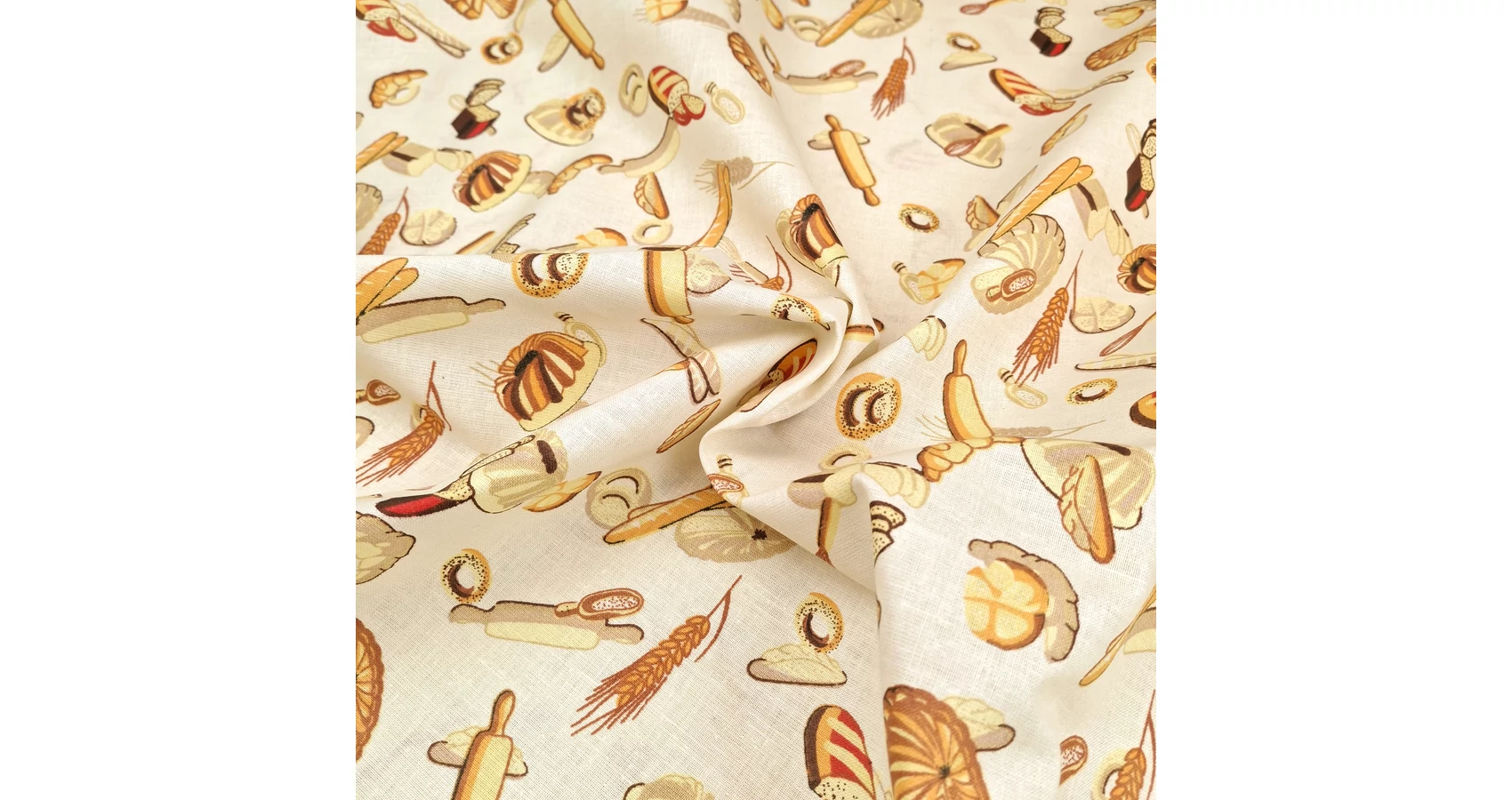 Pamutvászon méteráru friss pékáru mintával. Méteráruként tartása viszonylag merev, de mosás során tapintása jelentősen puhul. Kiváló alapanyag ruházati termékek, konyhai, illetve egyéb lakásdekorációs textíliák varrásához, de számos kézműves termék is készül belőle.