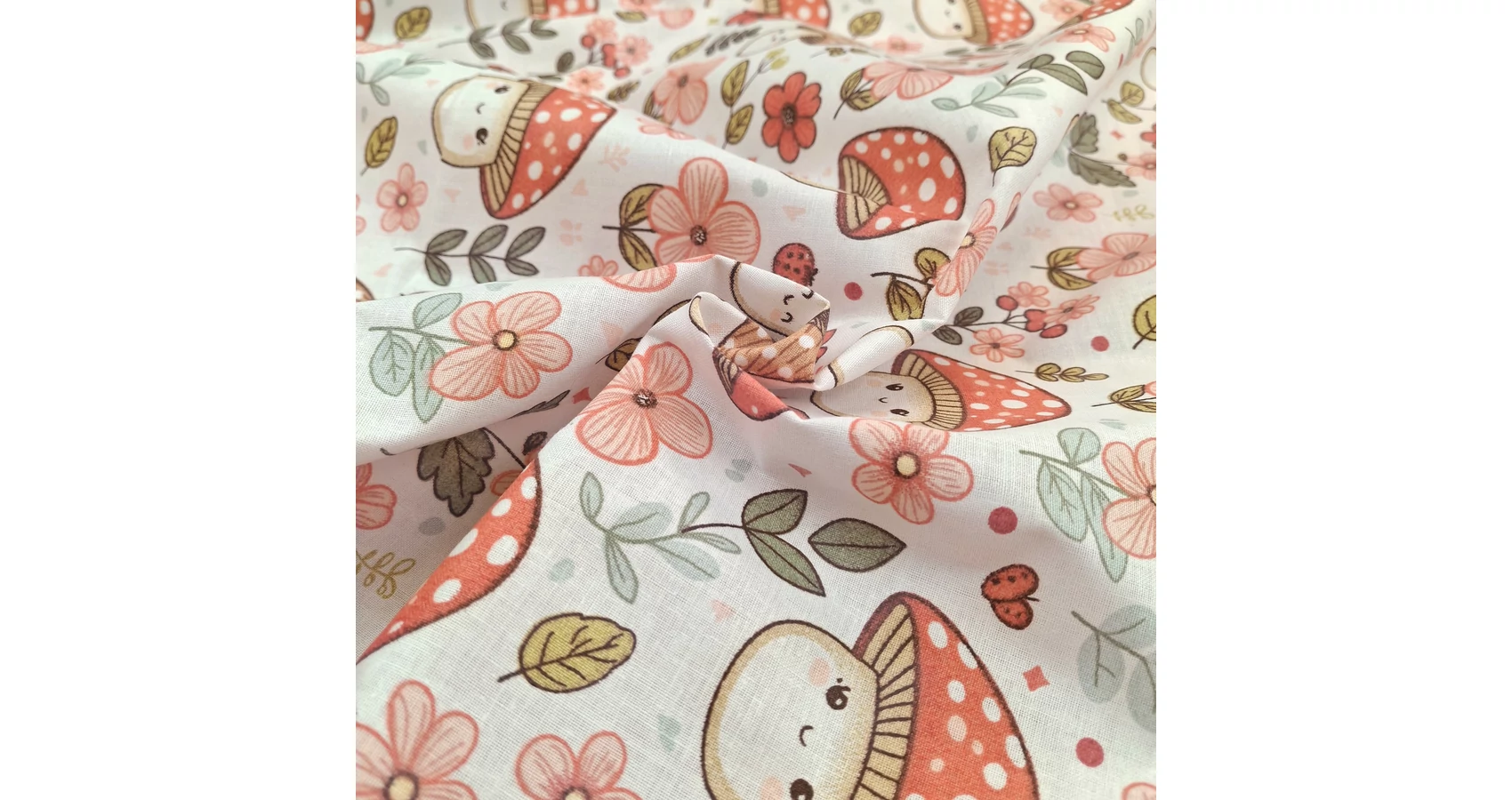 Pamutvászon méteráru gombás-virágos mintával. Méteráruként tartása viszonylag merev, de mosás során tapintása jelentősen puhul. Kiváló alapanyag ruházati termékek, konyhai, illetve egyéb lakásdekorációs textíliák varrásához, de számos kézműves termék is készül belőle.