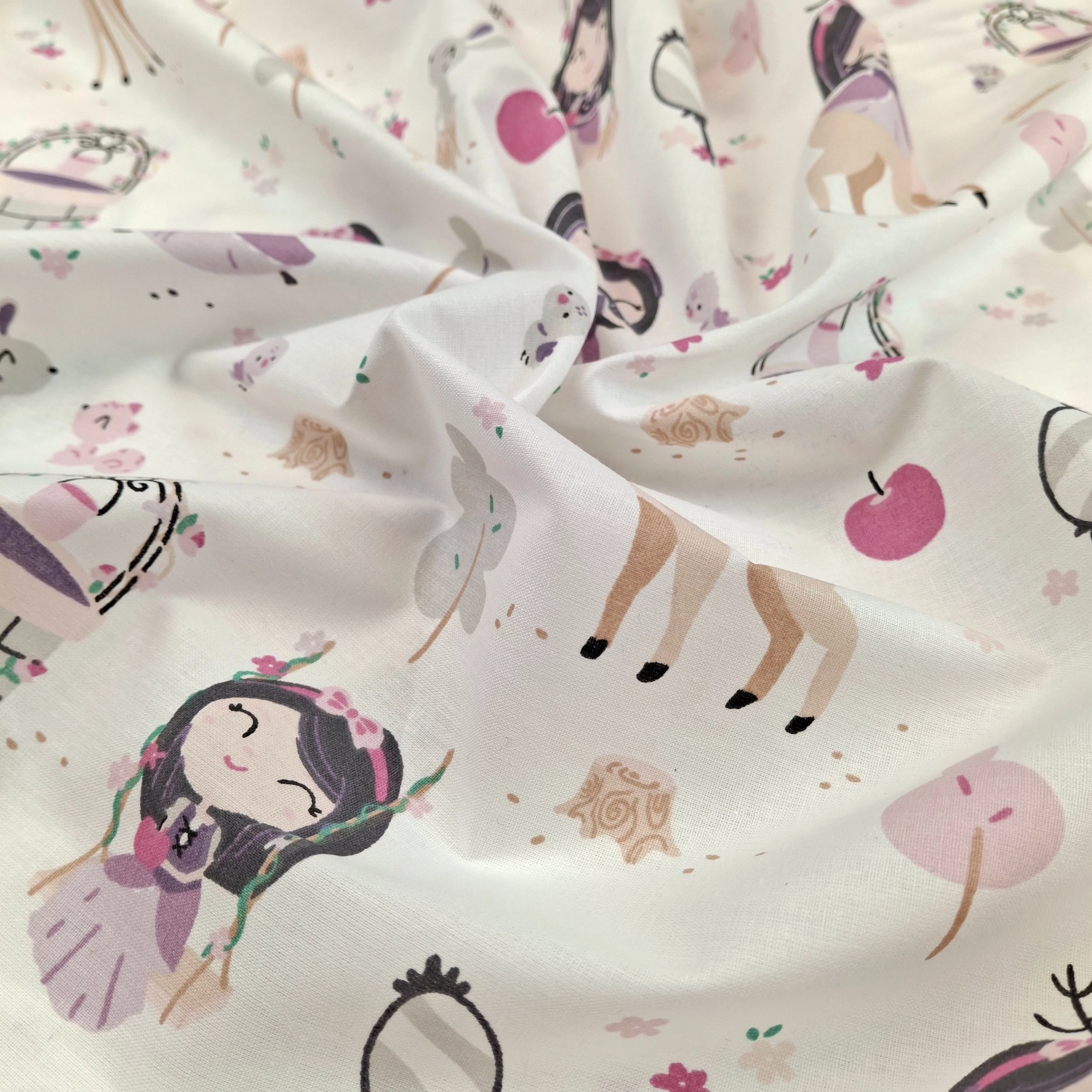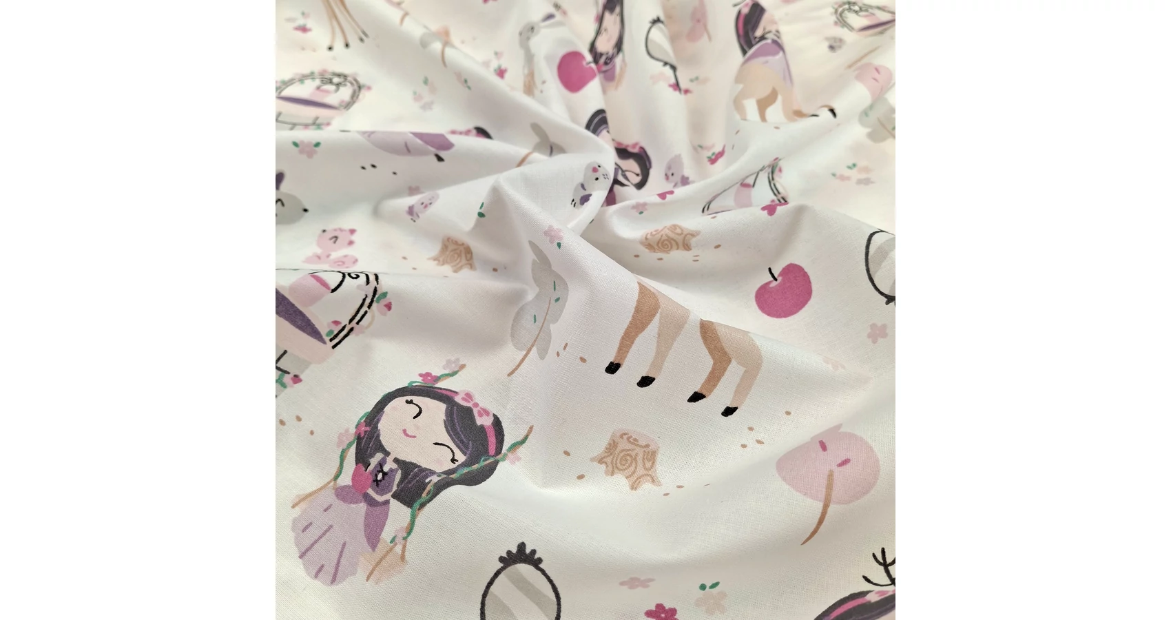 Pamutvászon méteráru fehér alapon hercegnős és erdei állatos mintával. Méteráruként tartása viszonylag merev, de mosás során tapintása jelentősen puhul. Kiváló alapanyag ruházati termékek, konyhai, illetve egyéb lakásdekorációs textíliák varrásához, de számos kézműves termék is készül belőle.