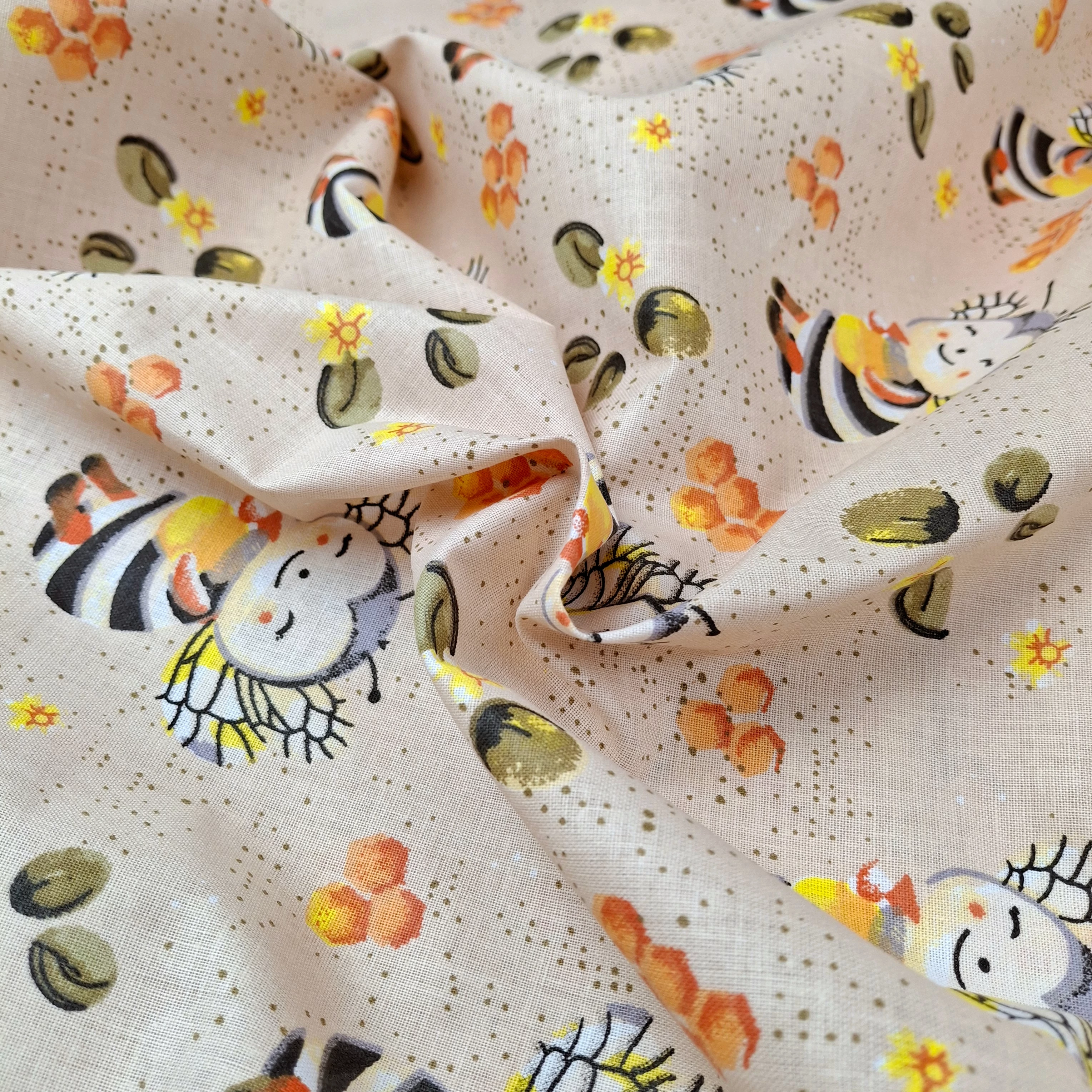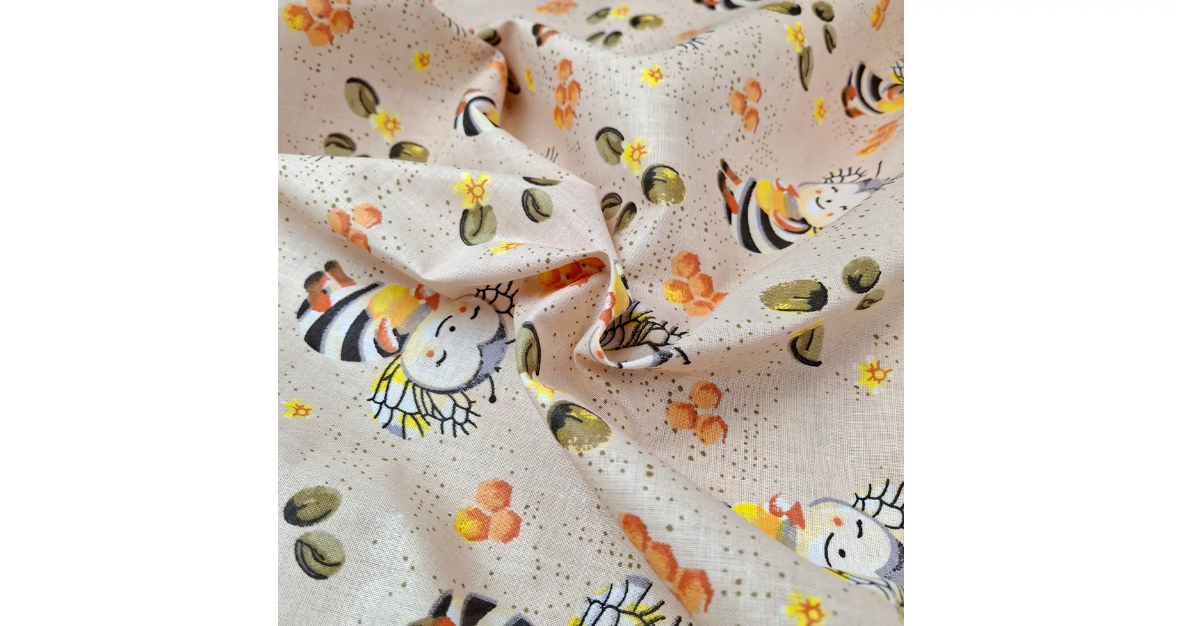 Pamutvászon méteráru bézs alapon mosolygó méhecskés mintával. Méteráruként tartása viszonylag merev, de mosás során tapintása jelentősen puhul. Kiváló alapanyag ruházati termékek, konyhai, illetve egyéb lakásdekorációs textíliák varrásához, de számos kézműves termék is készül belőle.