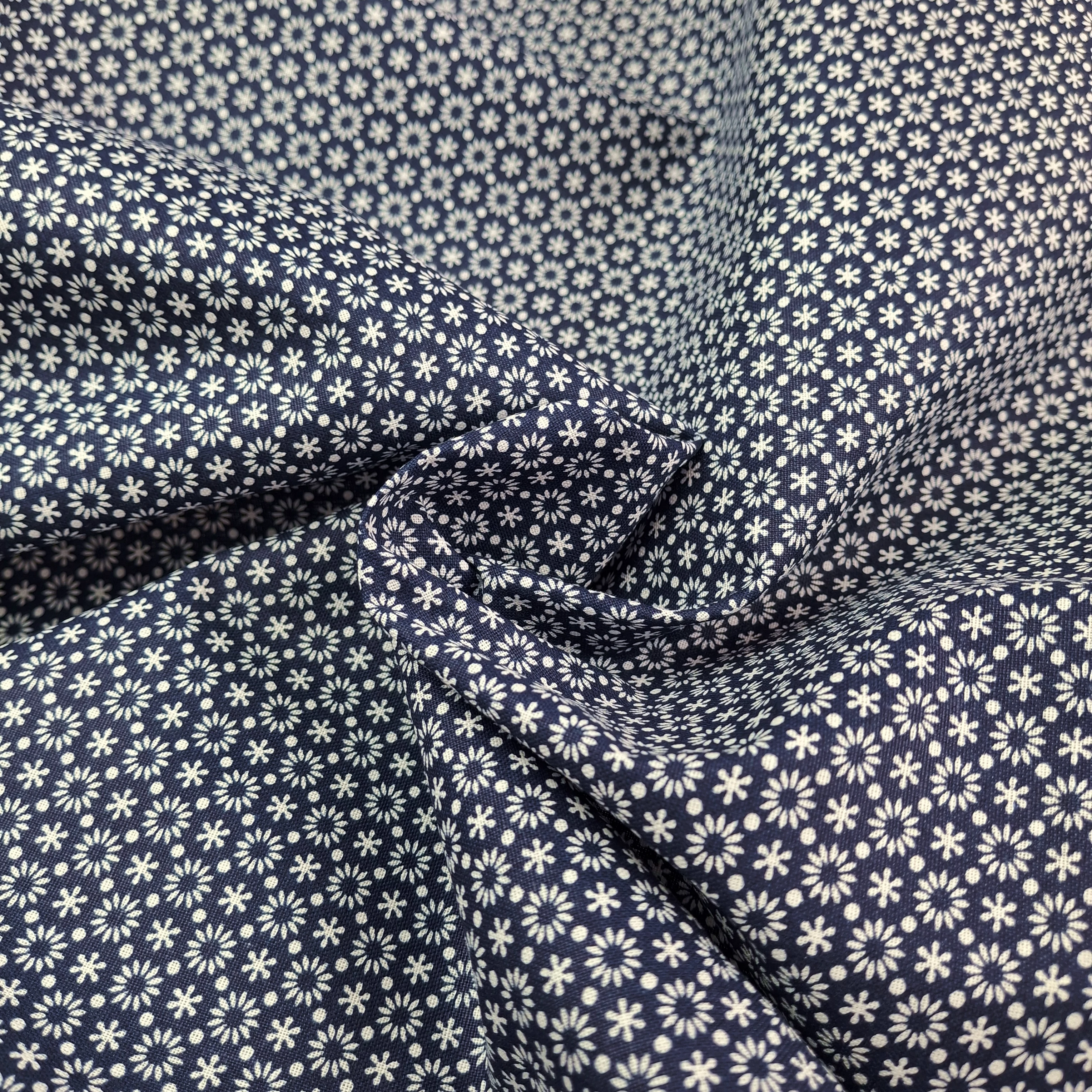 Pamutvászon, nyomott – Kékfestő, apró csillag és virág mintával, kék
