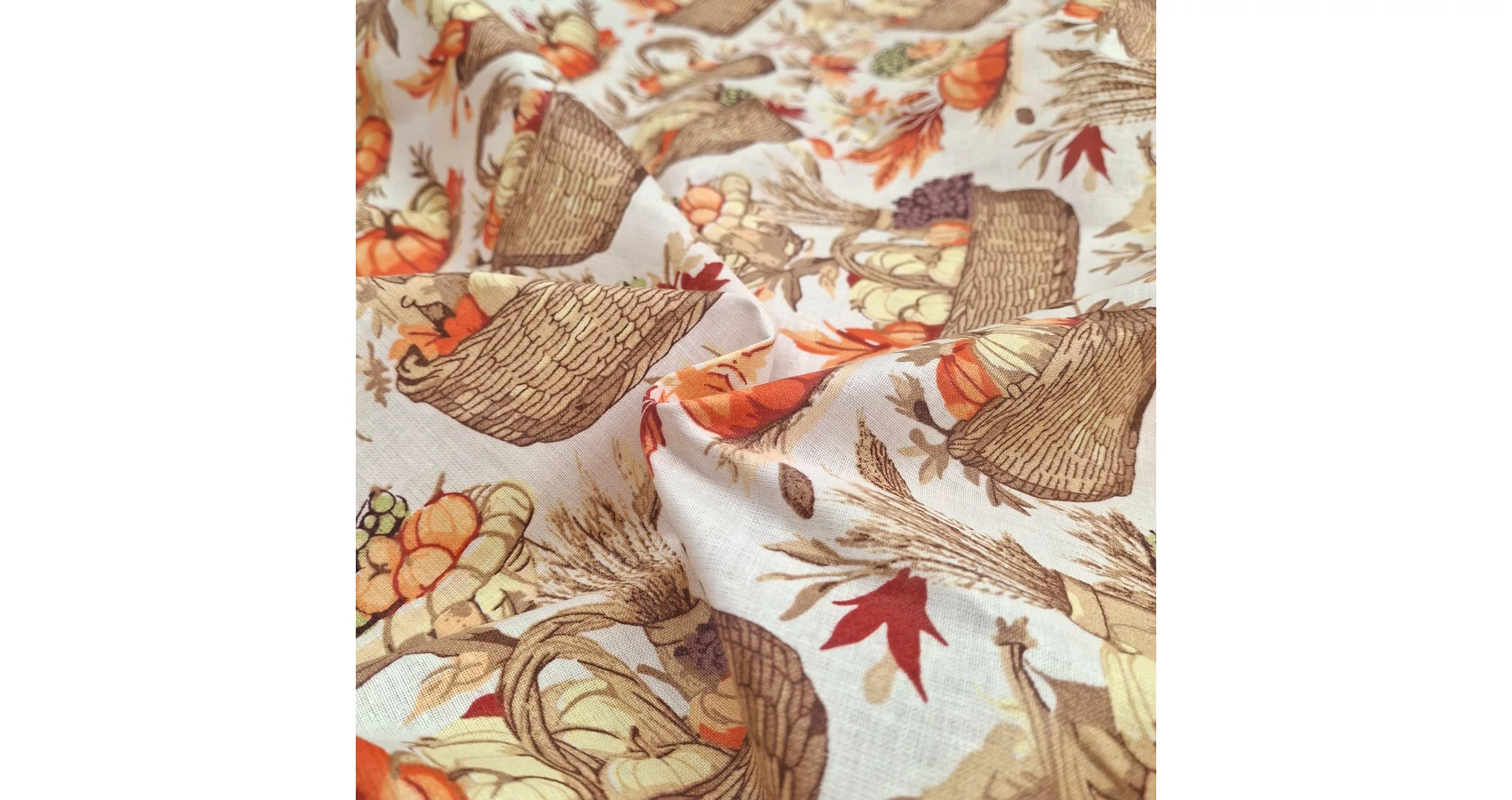 Pamutvászon méteráru fehér alapon őszi kosaras mintával. Méteráruként tartása viszonylag merev, de mosás során tapintása jelentősen puhul. Kiváló alapanyag ruházati termékek, konyhai, illetve egyéb lakásdekorációs textíliák varrásához, de számos kézműves termék is készül belőle.