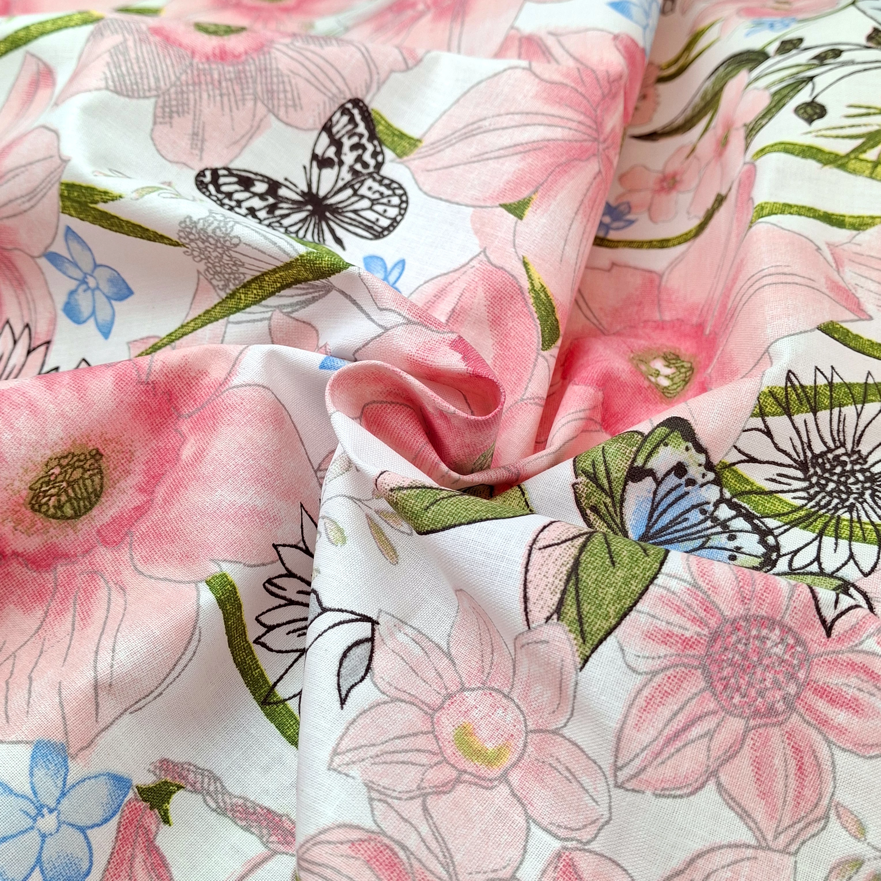 Pamutvászon méteráru rózsaszín virág és kék pillangó mintával. Méteráruként tartása viszonylag merev, de mosás során tapintása jelentősen puhul. Kiváló alapanyag ruházati termékek, konyhai, illetve egyéb lakásdekorációs textíliák varrásához, de számos kézműves termék is készül belőle.