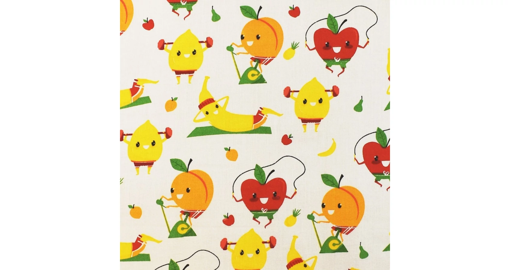 Pamutvászon méteráru fehér alapon színes, sportoló banán, narancs és alma mintával. Sokoldalúan felhasználható, közkedvelt természetes alapanyagú méteráru. Kiváló ruházati termékek, konyhai, illetve egyéb lakásdekorációs textíliák varrásához és számos kézműves termék is készül belőle. Természetes anyag révén felhasználás előtt érdemes beavatni, mivel a textil az első mosáskor 8-10%-ot zsugorodhat.