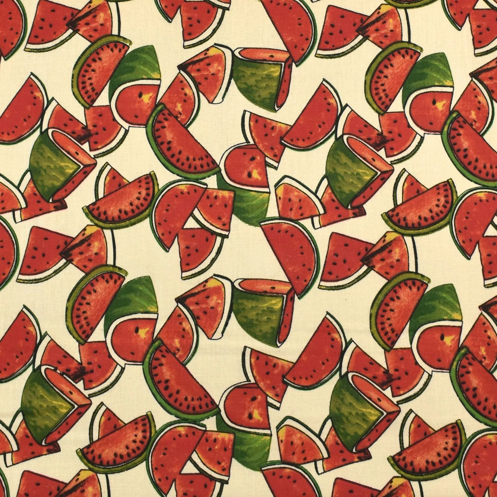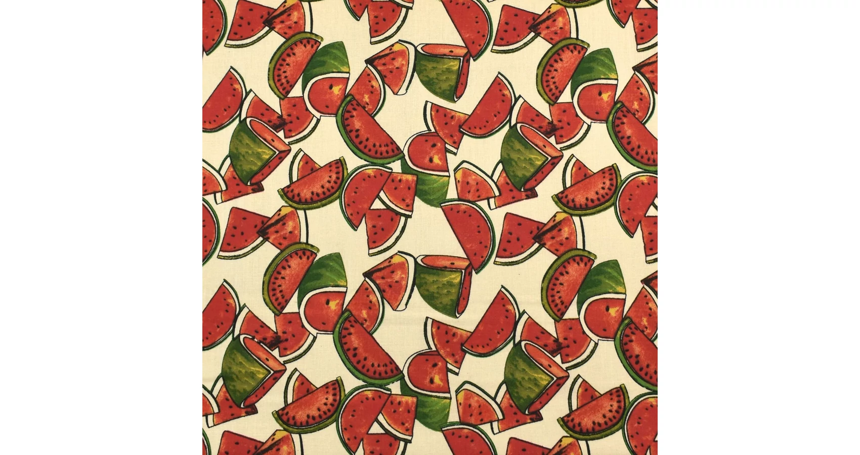Pamutvászon méteráru vajszínű alapon színes görögdinnyés mintával. Kiváló alapanyag ruházati termékek, konyhai, illetve egyéb lakásdekorációs textíliák varrásához, de számos kézműves termék is készül belőle. A foltvarró – patchwork – technika kedvelt alapanyaga. Természetes anyag révén felhasználás előtt érdemes beavatni, mivel a textil az első mosáskor 8-10%-ot zsugorodhat.