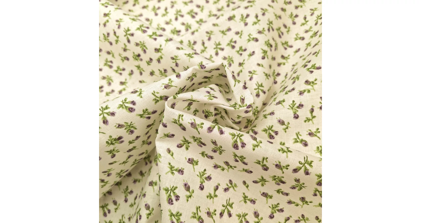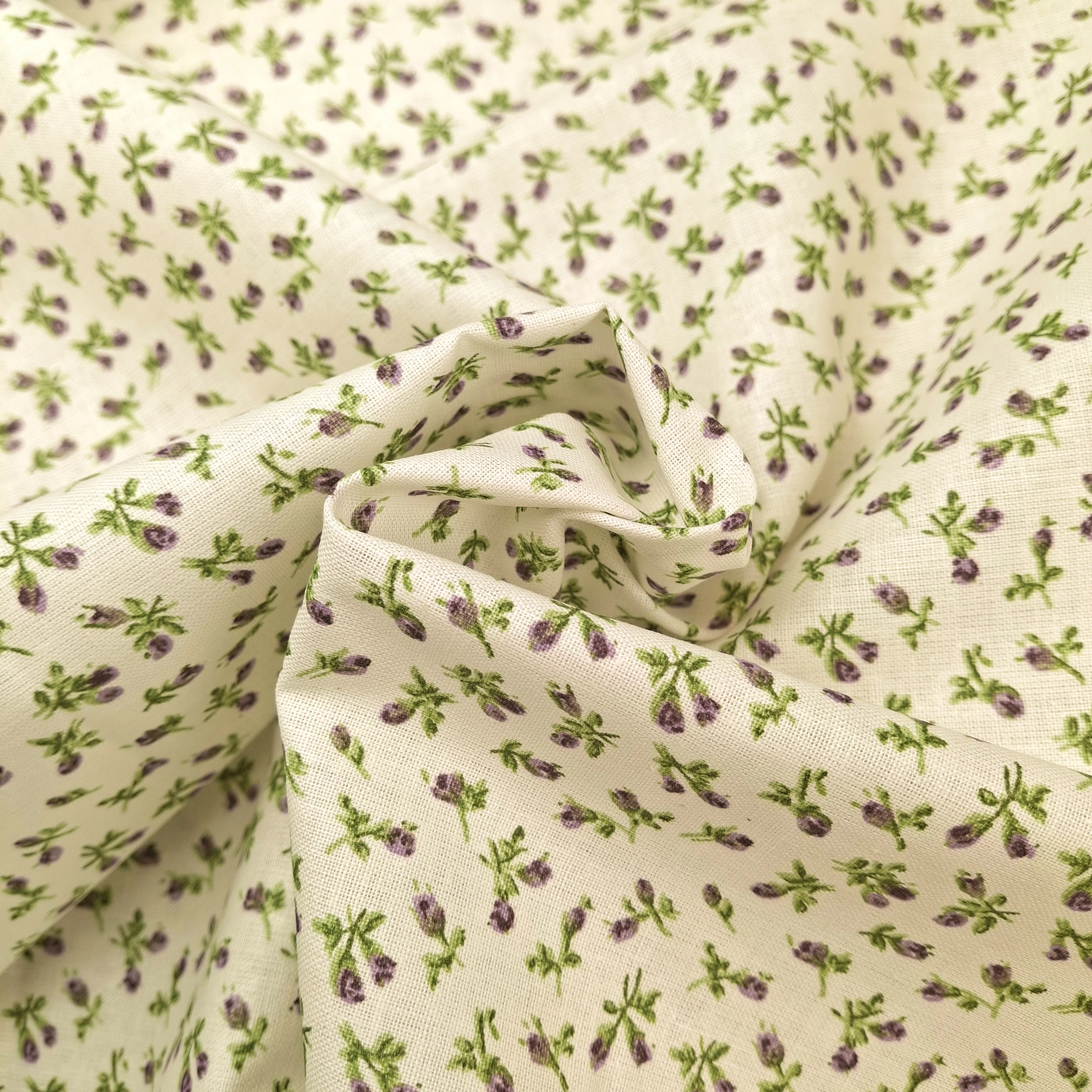 Pamutvászon méteráru vanília színű alapon apró virágos mintával. Méteráruként tartása viszonylag merev, de mosás során tapintása jelentősen puhul. Kiváló alapanyag ruházati termékek, konyhai, illetve egyéb lakásdekorációs textíliák varrásához, de számos kézműves termék is készül belőle.