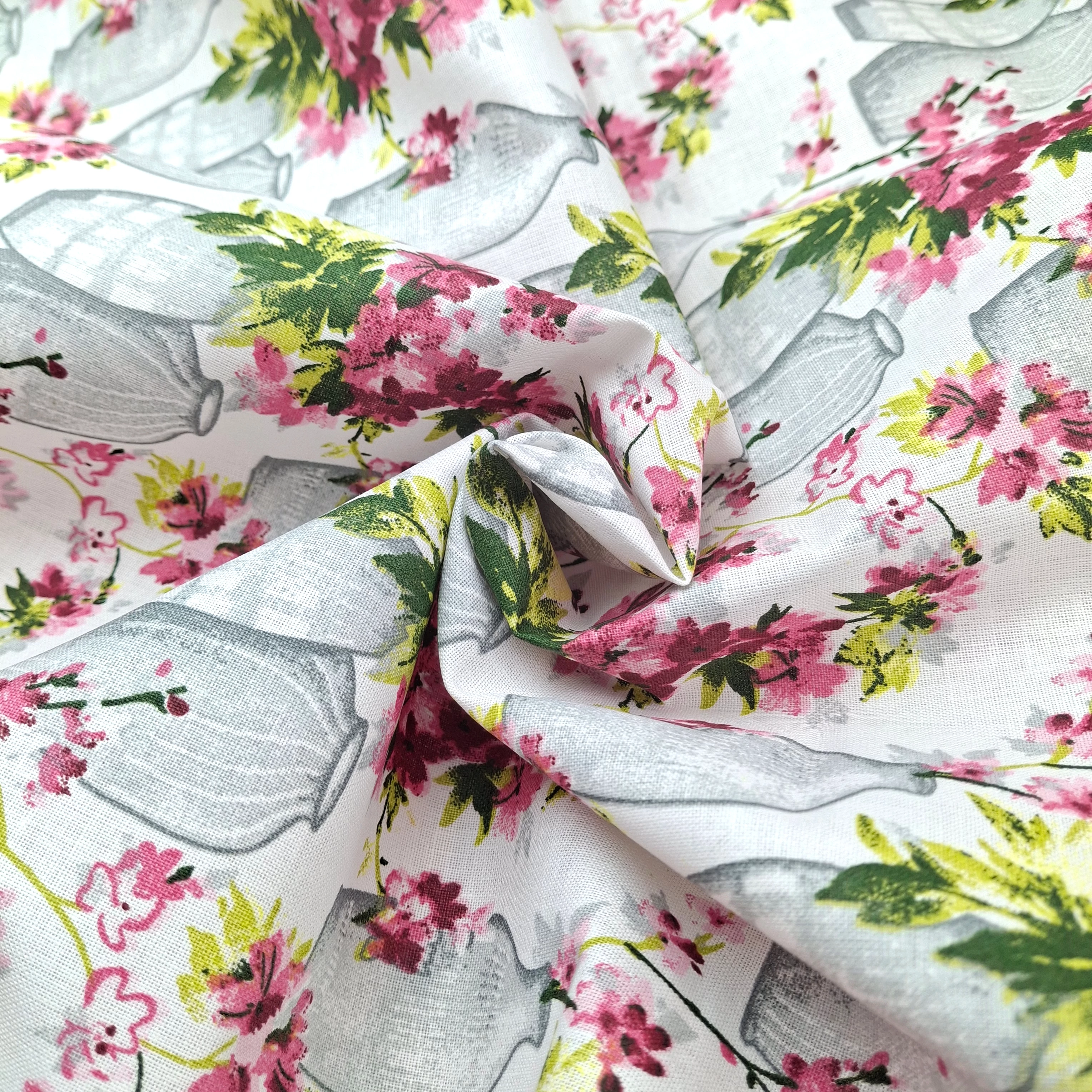 Pamutvászon méteráru virágos váza mintával. Méteráruként tartása viszonylag merev, de mosás során tapintása jelentősen puhul. Kiváló alapanyag ruházati termékek, konyhai, illetve egyéb lakásdekorációs textíliák varrásához, de számos kézműves termék is készül belőle.