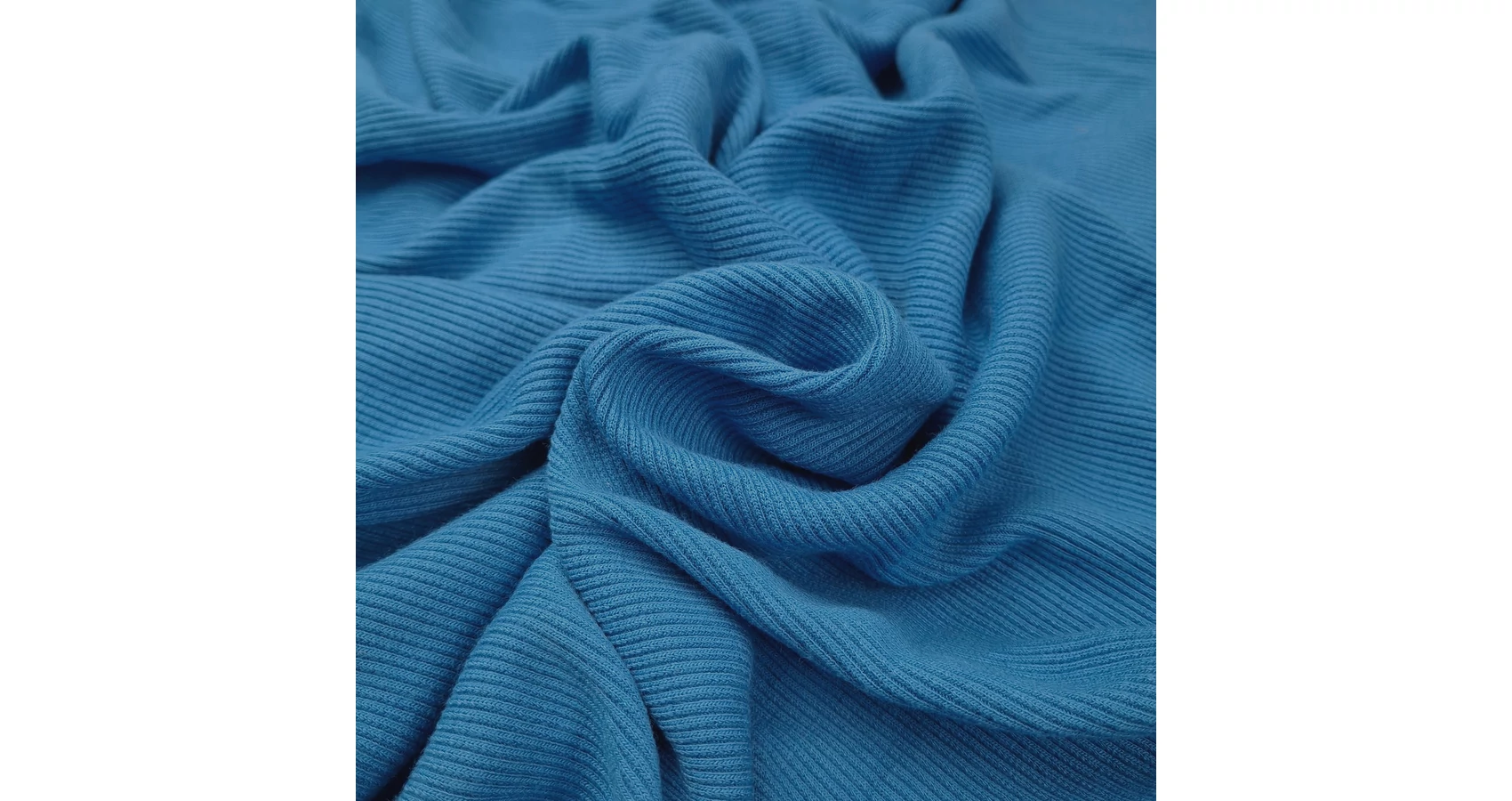 Körkötött passzé anyag kék színben. Közepes vastagságú, matt felületű, mindkét irányban rugalmas kötött méteráru.