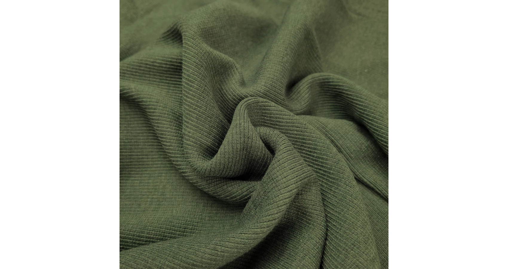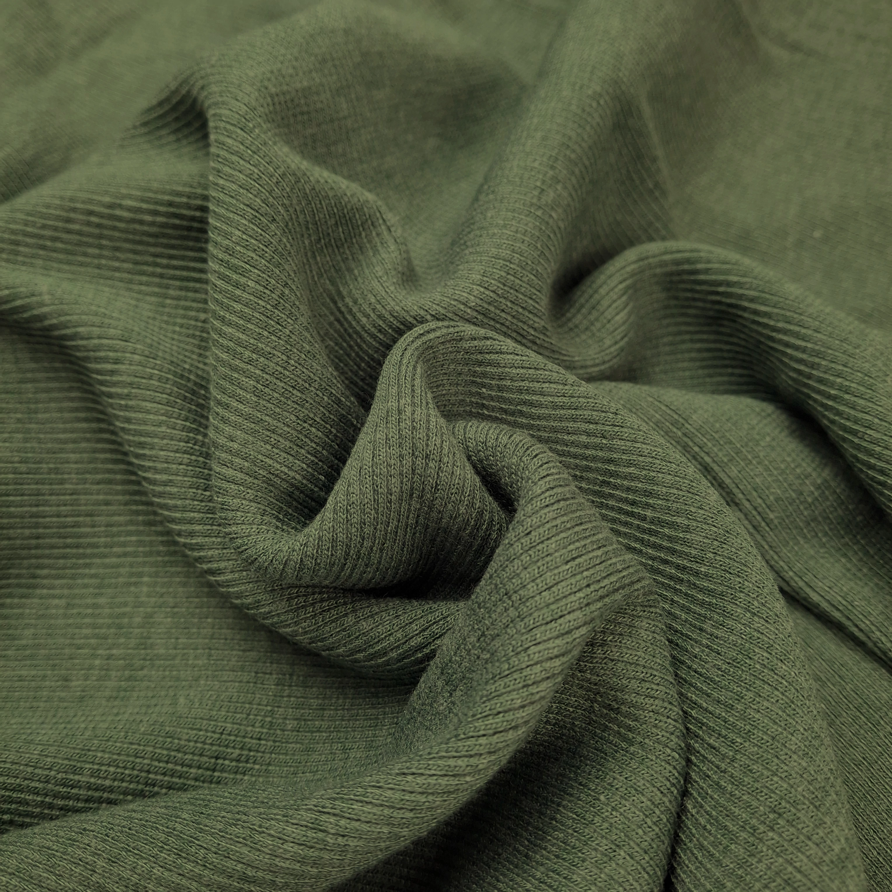 Körkötött passzé anyag kekizöld színben. Közepes vastagságú, matt felületű, mindkét irányban rugalmas kötött méteráru.