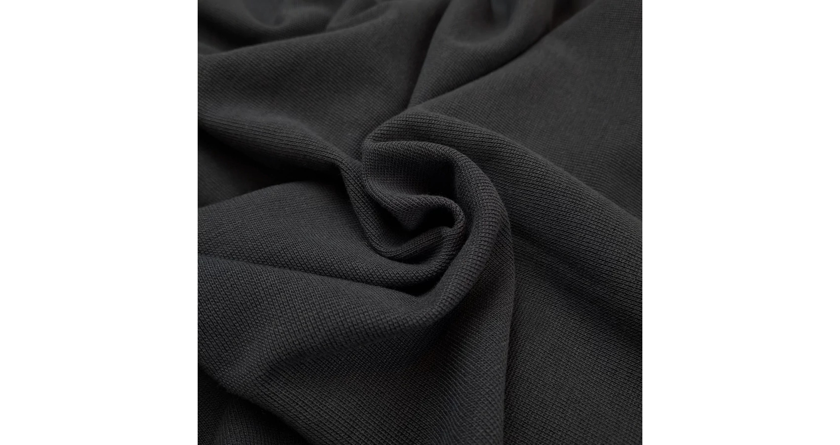Körkötött passzé anyag sötétszürke színben. Közepes vastagságú, matt felületű, mindkét irányban rugalmas kötött méteráru.