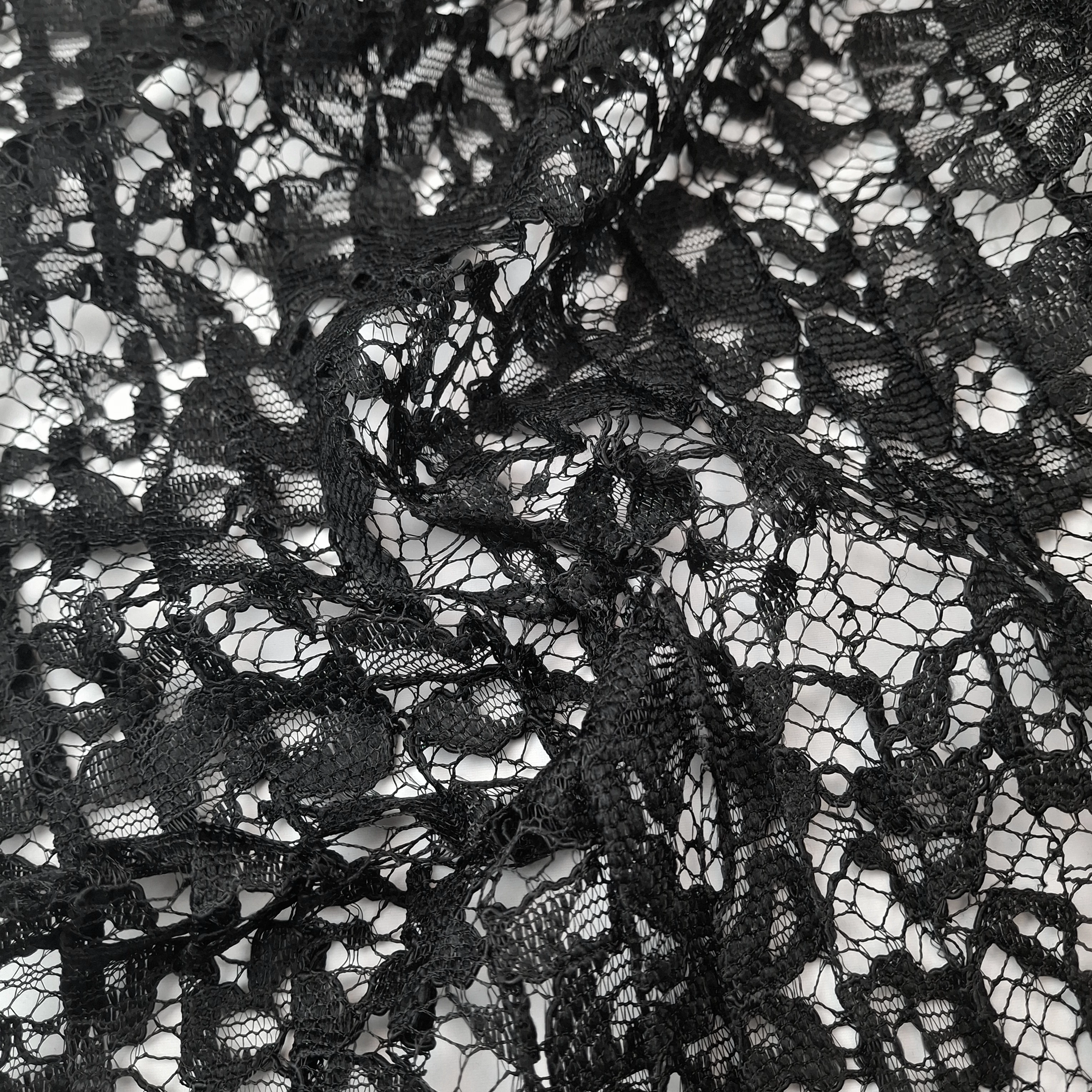 Pliszírozott csipke méteráru, fekete színben, bordűrrel, pliszérozott felülettel. Harmonika-szerű pliszírozott felülete formatartó. Különleges felületéből adódóan a lapolt felület széthúzáskor kissé rugalmasnak tűnhet, azonban anyaga egyáltalán nem elasztikus. Lágy esésű, kellemes tapintású alkalmi textil, melynek egyik széle bordűrös.