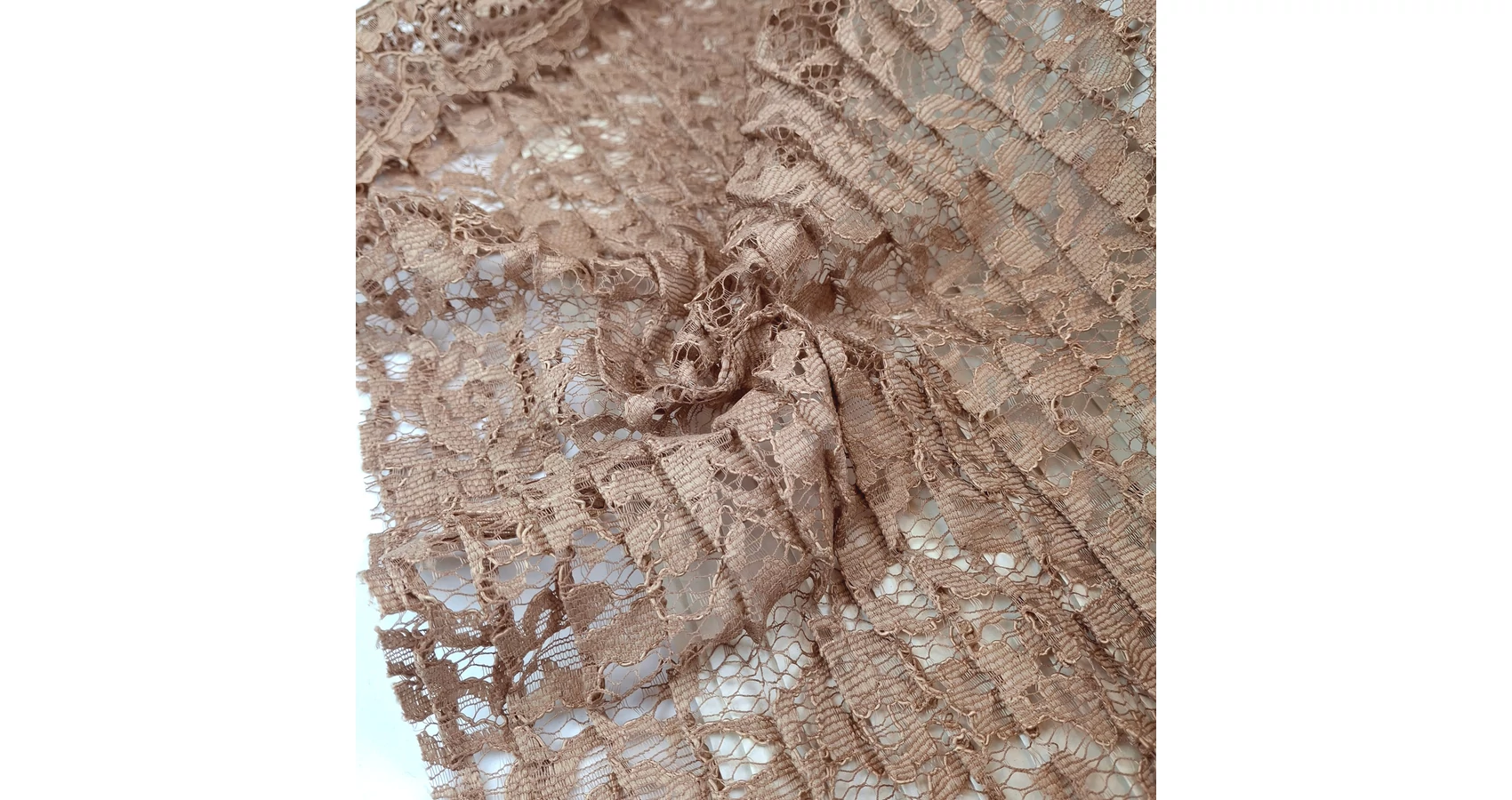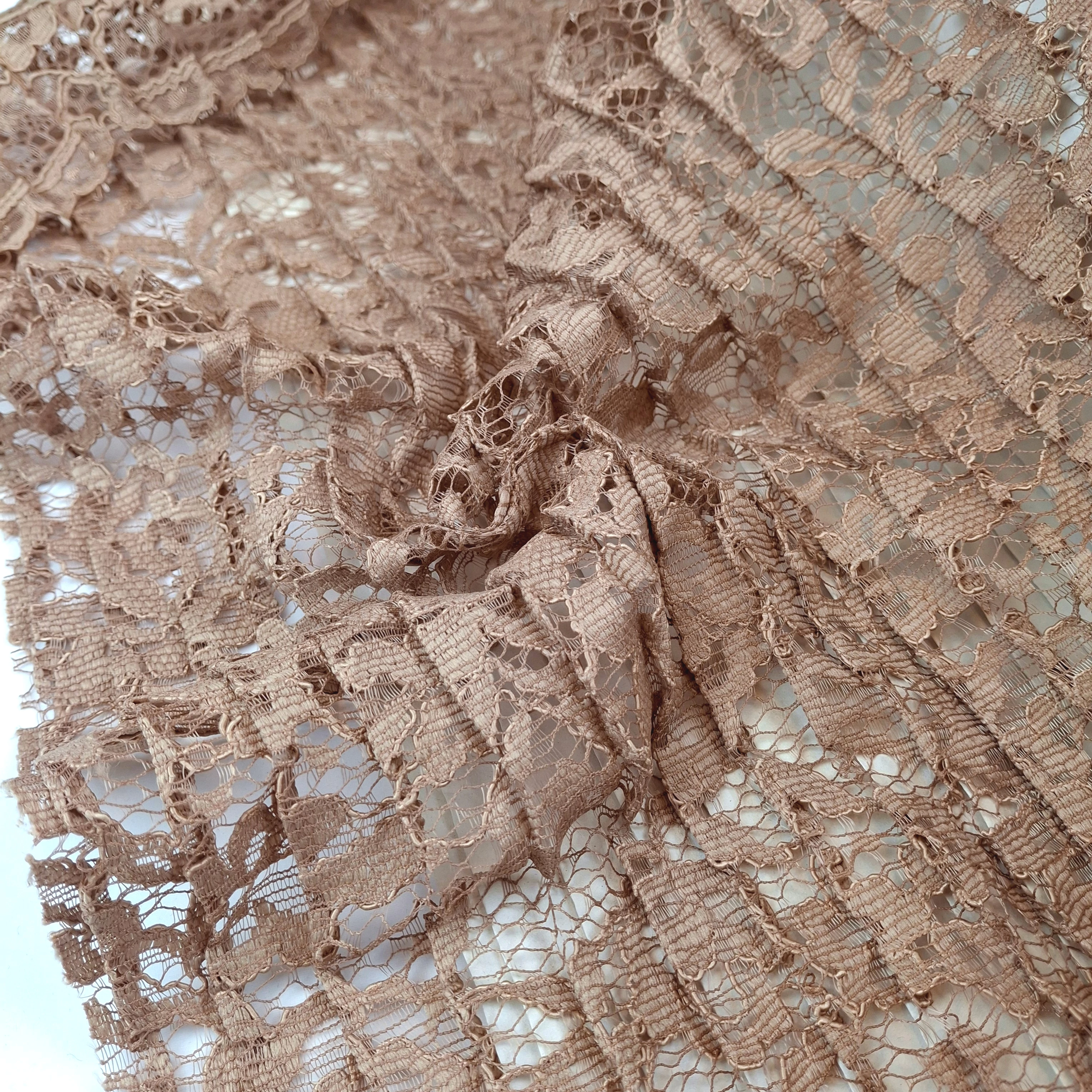 Pliszírozott csipke méteráru, mályvás-bézs színben, bordűrrel, pliszérozott felülettel. Harmonika-szerű pliszírozott felülete formatartó. Különleges felületéből adódóan a lapolt felület széthúzáskor kissé rugalmasnak tűnhet, azonban anyaga egyáltalán nem elasztikus. Lágy esésű, kellemes tapintású alkalmi textil, melynek egyik széle bordűrös.