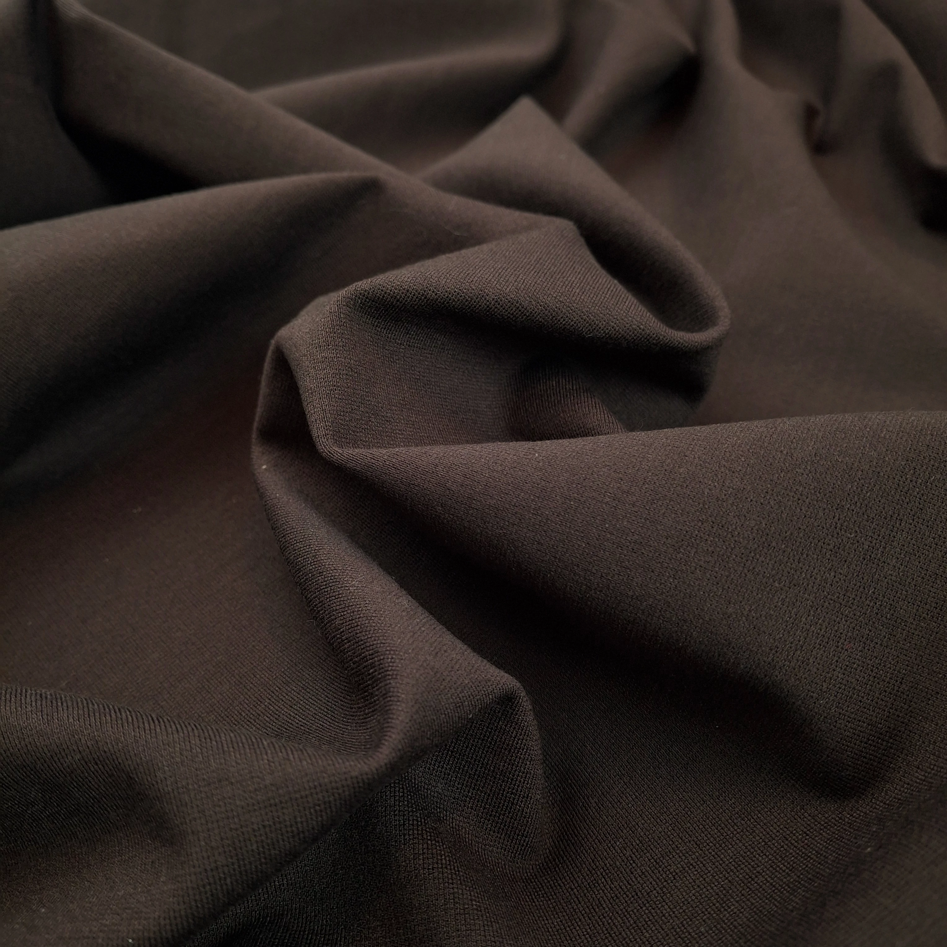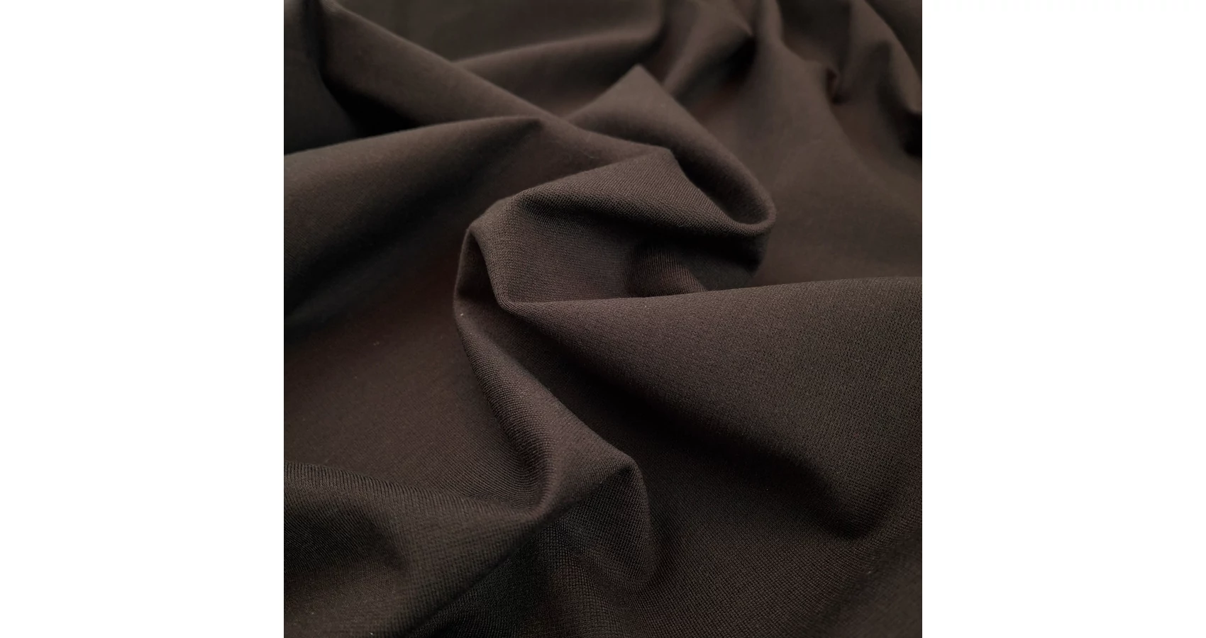 Ponti róma méteráru sötétbarna színben. Kötött hatású, mindkét irányban rugalmas anyagának köszönhetően kényelmes viseletet biztosít. Viselkedésében jersey jellegű, kellemes tapintású, matt és sima felületű, jól szellőző, kiváló átmeneti anyag.
