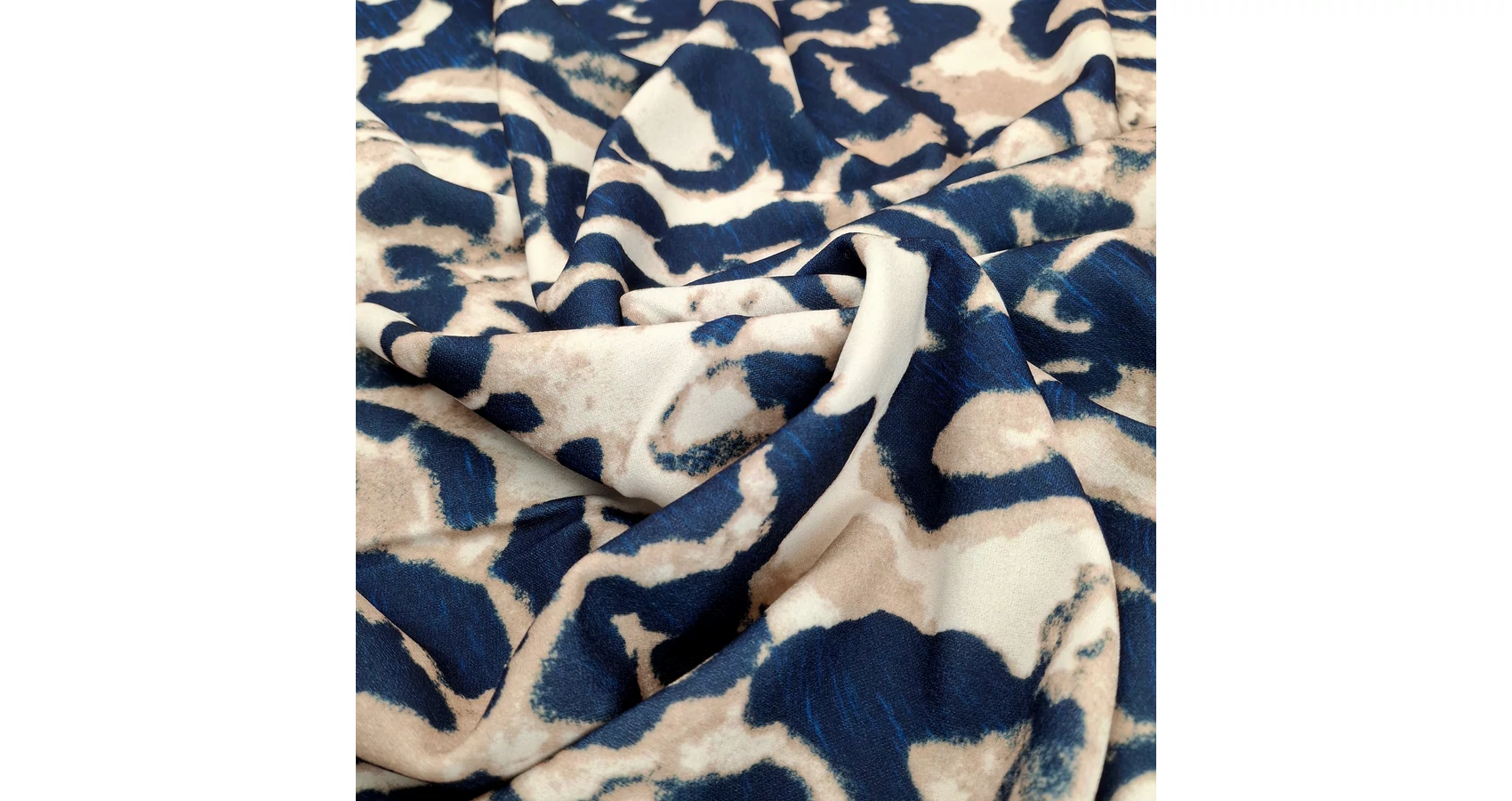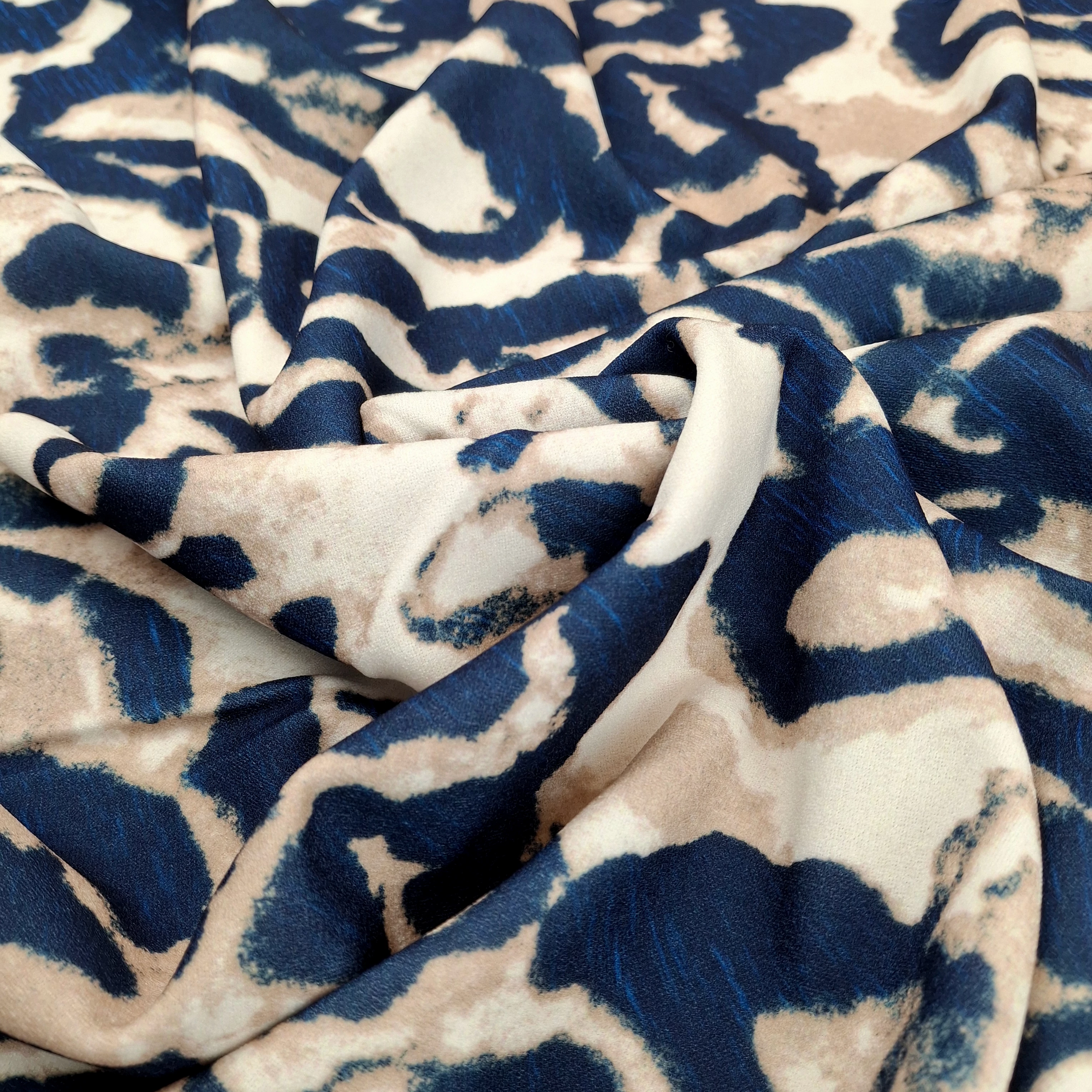 Scuba Crepe (krepp) méteráru sötétkék színben, párduc mintával. Kissé érdes felületű, mindkét irányban rugalmas anyag, tökéletes átmeneti és téli textil. Műszál tartalma ellenére, köszönhetően a speciális gyártási technológiájának a belőle készült ruhák szép tartással rendelkeznek és kellemes viseletet biztosítanak.