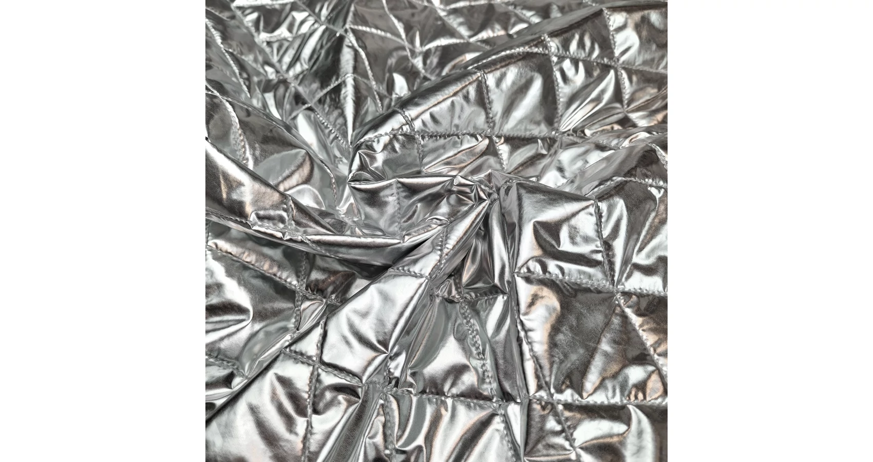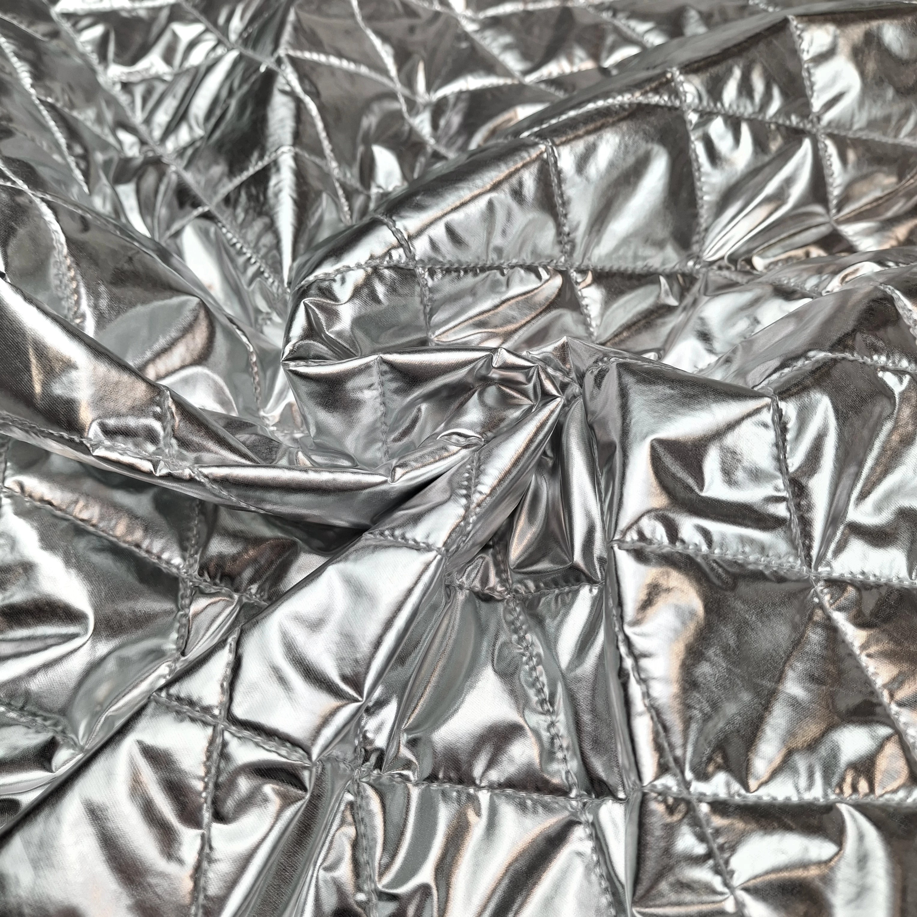 Steppelt anyag ezüst színben. A felső, metálfényű, ezüst színű anyag egy töltővlies bélés réteggel van kombinálva. Felső ezüst rétege vízlepergető. Felülete 5 x 5 cm-es rombusz mintában steppelt. Könnyű, nem elasztikus, kellemes meleget adó vastag méteráru.