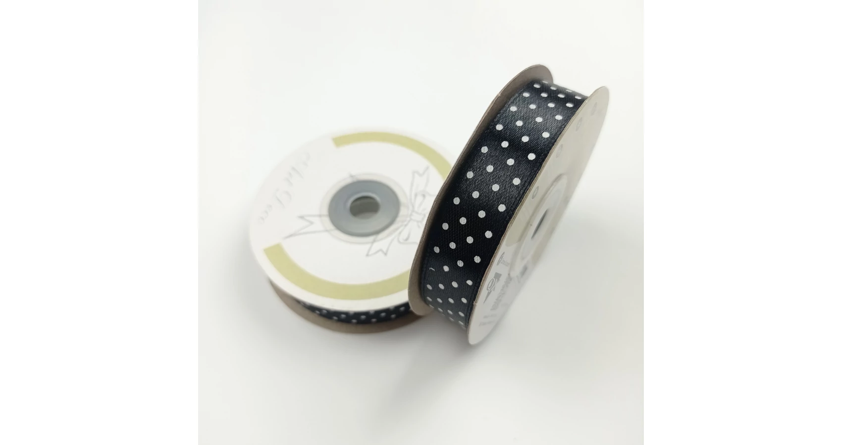 Fekete színű szatén szalag, pöttyös mintával. Hűvös tapintású, kissé csúszós, elsősorban virágkötészeti és dekorációs célra készített szalag. Szélei szépen eldolgozottak, de a vágást érdemes öngyújtó segítségével vékonyan megolvasztani, hogy ne foszoljon el a használat során.