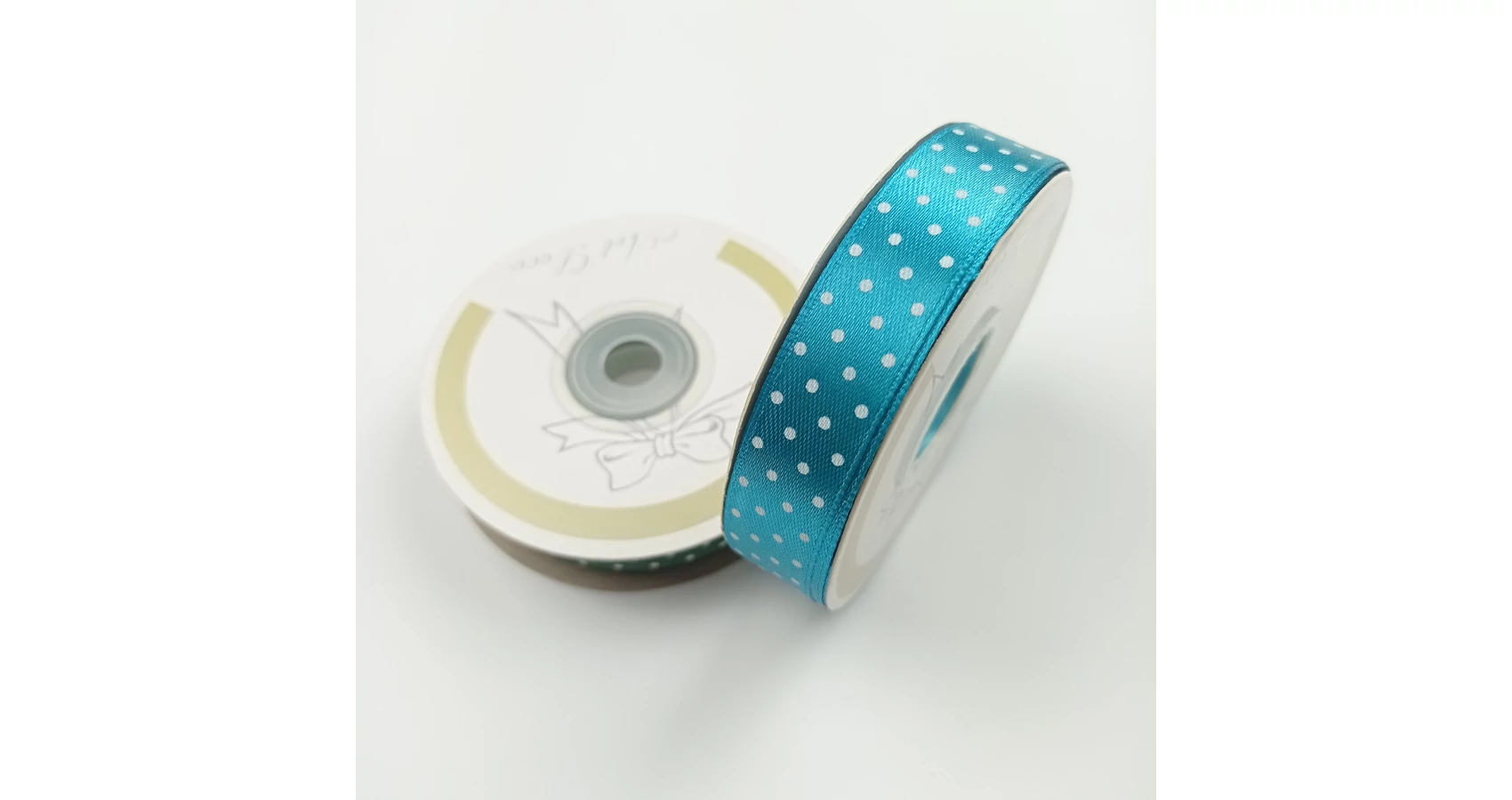 Türkiz színű szatén szalag, pöttyös mintával. Hűvös tapintású, kissé csúszós, elsősorban virágkötészeti és dekorációs célra készített szalag. Szélei szépen eldolgozottak, de a vágást érdemes öngyújtó segítségével vékonyan megolvasztani, hogy ne foszoljon el a használat során.