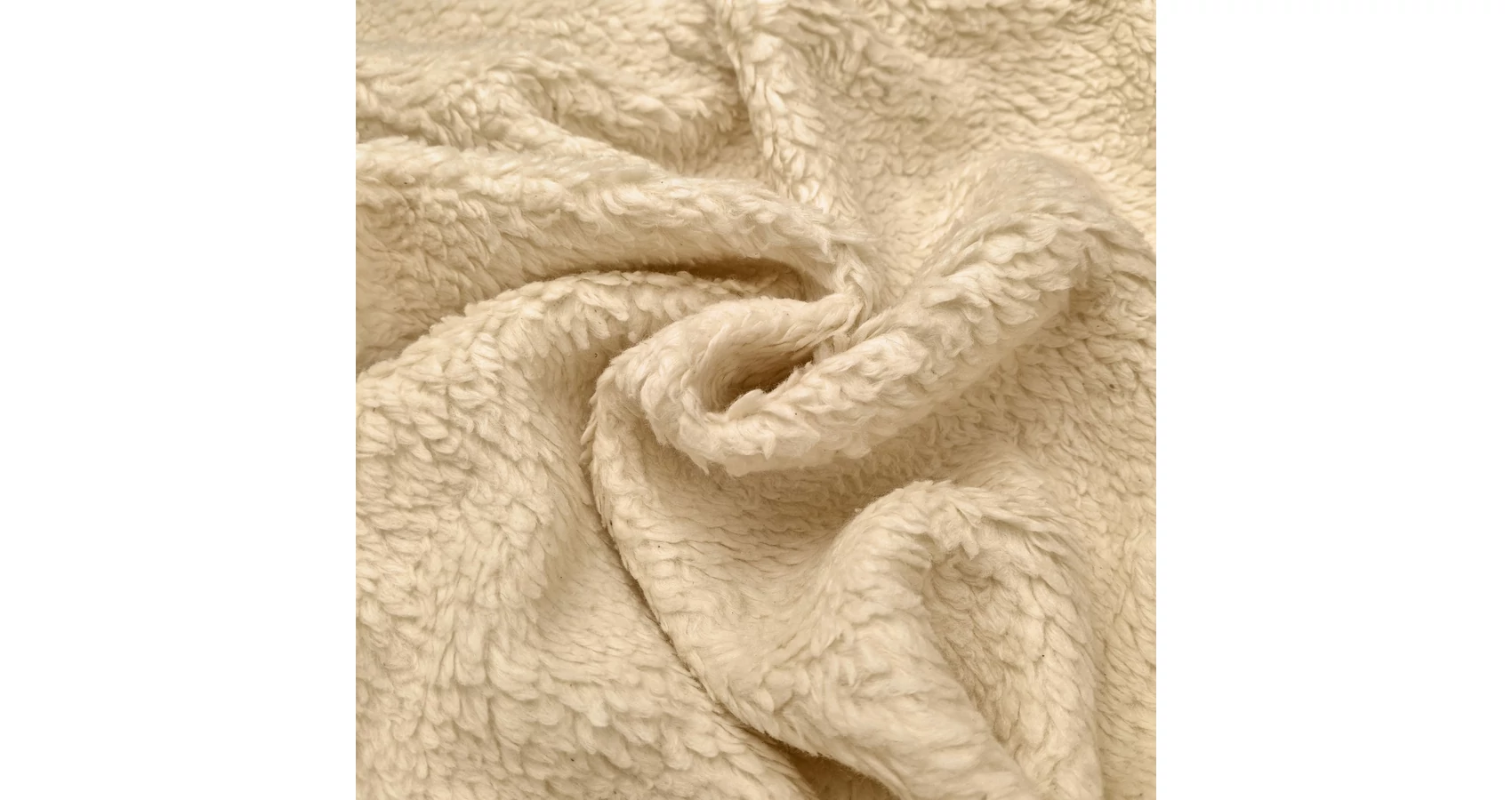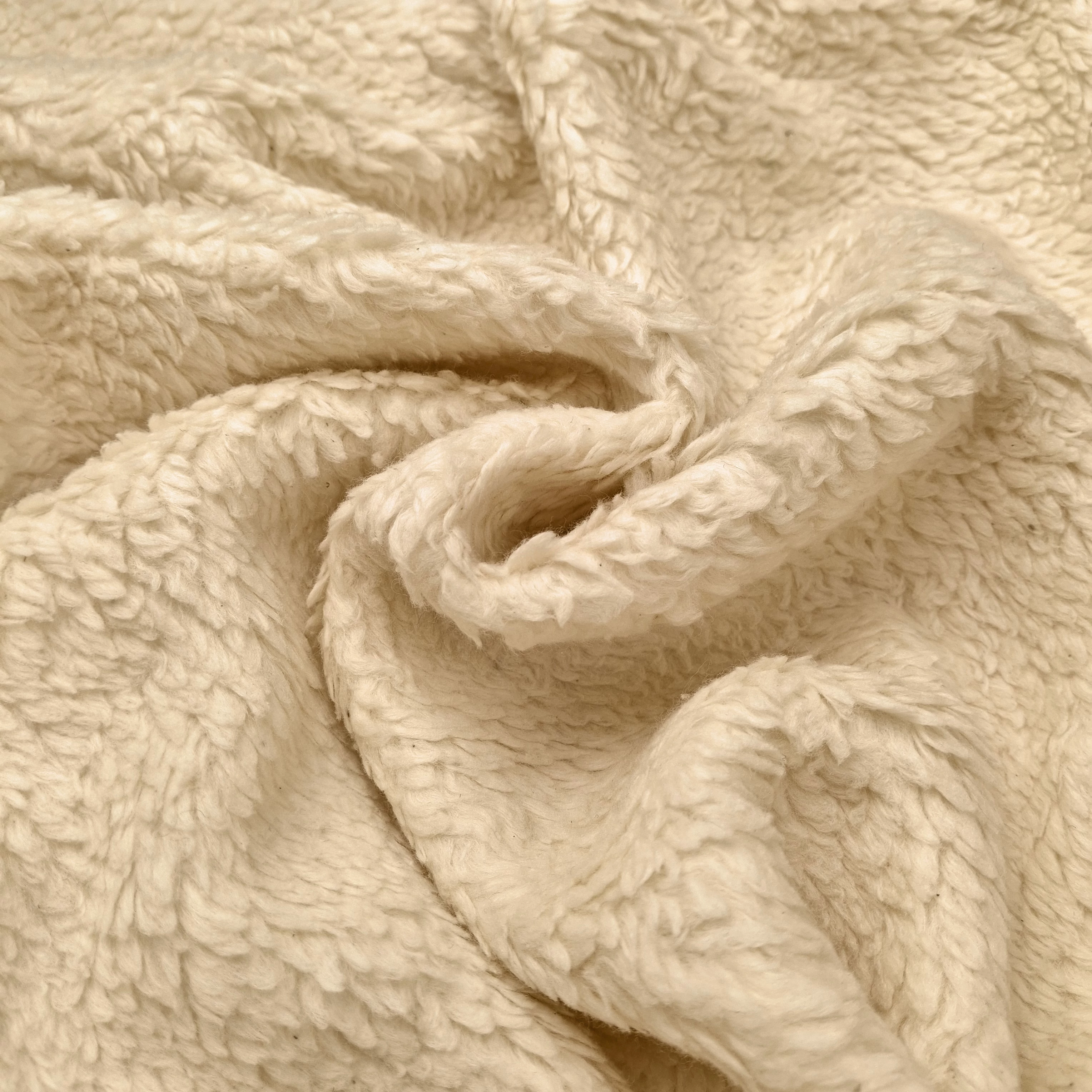 Teddy műszőrme méteráru nyers színben, plüssmackó jellegű megjelenéssel. Pamut tartalmának köszönhetően kifejezetten puha. A szőrme szálai kb. 0,5 - 1 cm hosszúak, fonák oldala poliészter szövet, amelynek nincs tartása, így könnyen formázható. Nem rugalmas, vastag anyag. Dús, puha tapmintású műszőrme.