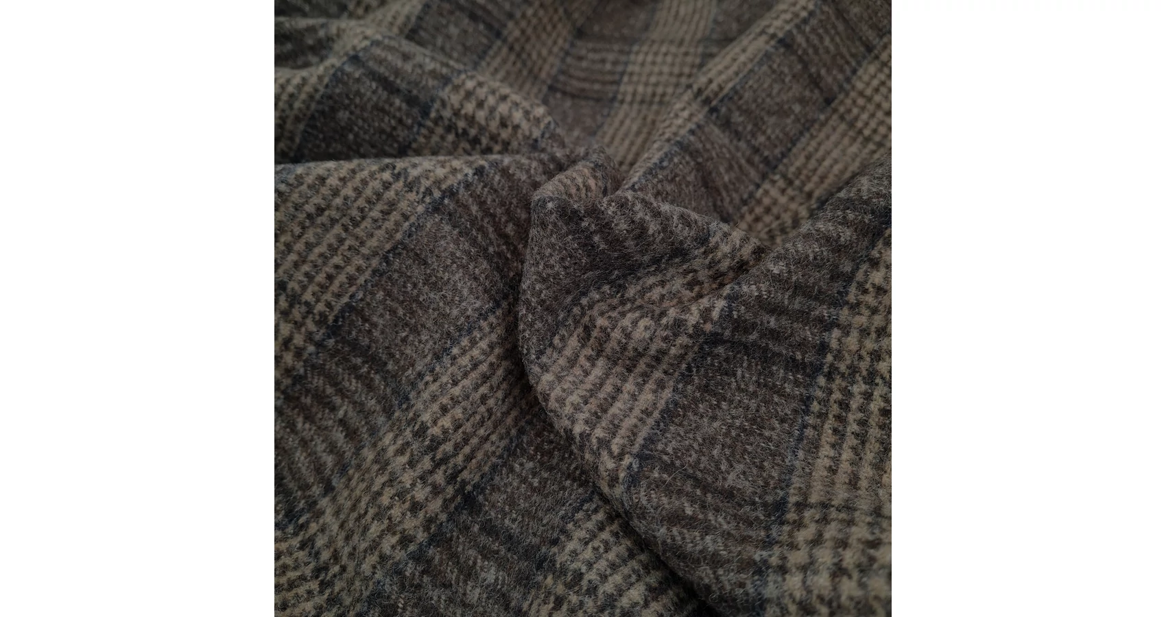 Tweed szövet méteráru sötétbarna és beige színben, kockás mintával. Kifejezetten vastag, erős szövésű gyapjúszövet. Gyapjú összetételének köszönhetően igazán jó hőtartó képességgel rendelkezik, így az őszi-téli hónapok megfelelő ruházati alapanyaga. Klasszikus megjelenésű, elegáns, szép tartású, vastag szövet anyag. Nem elasztikus, kellemes, gyapjúsan szúrós tapintású.