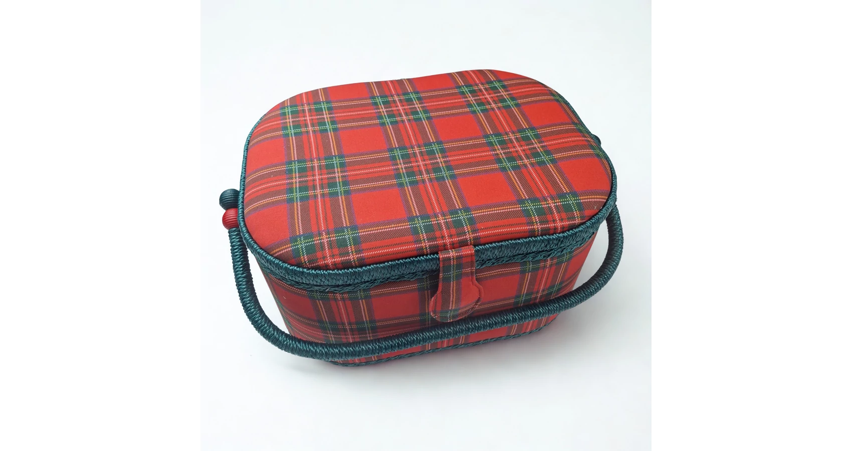 Kiváló minőségű varrós doboz piros-zöld kockás mintával. Fedele mágneses csattal záródó, kivehető osztott tálcás tárolóval rendelkező tágas doboz.