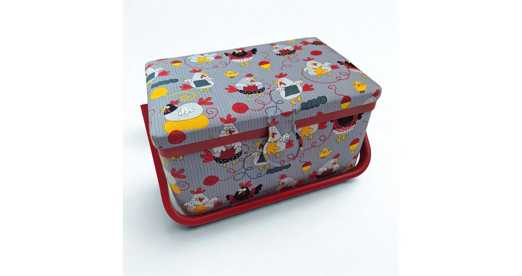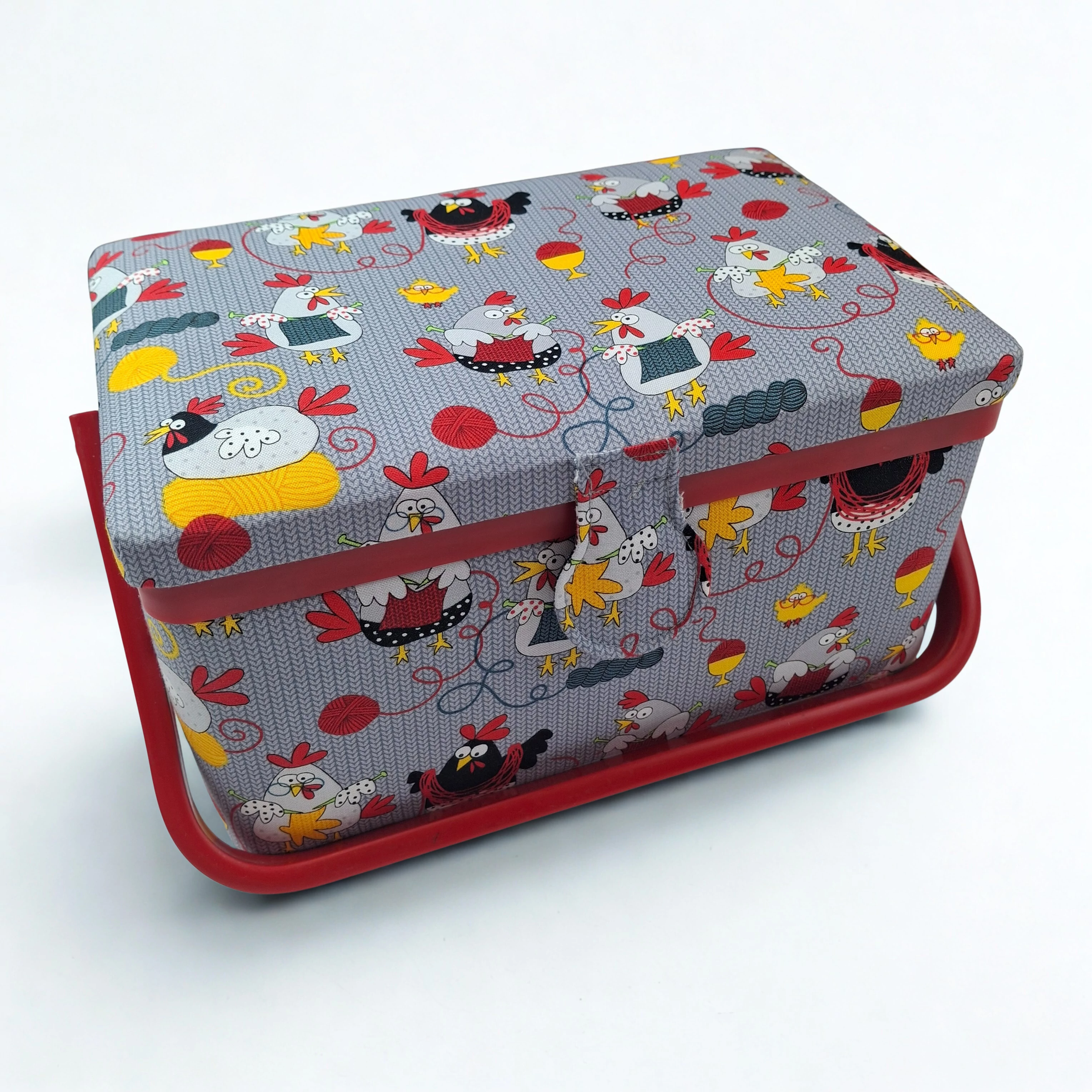 Kiváló minőségű varrós doboz tyúkanyó mintával. Fedele mágneses csattal záródó, kivehető osztott tálcás tárolóval rendelkező tágas doboz.