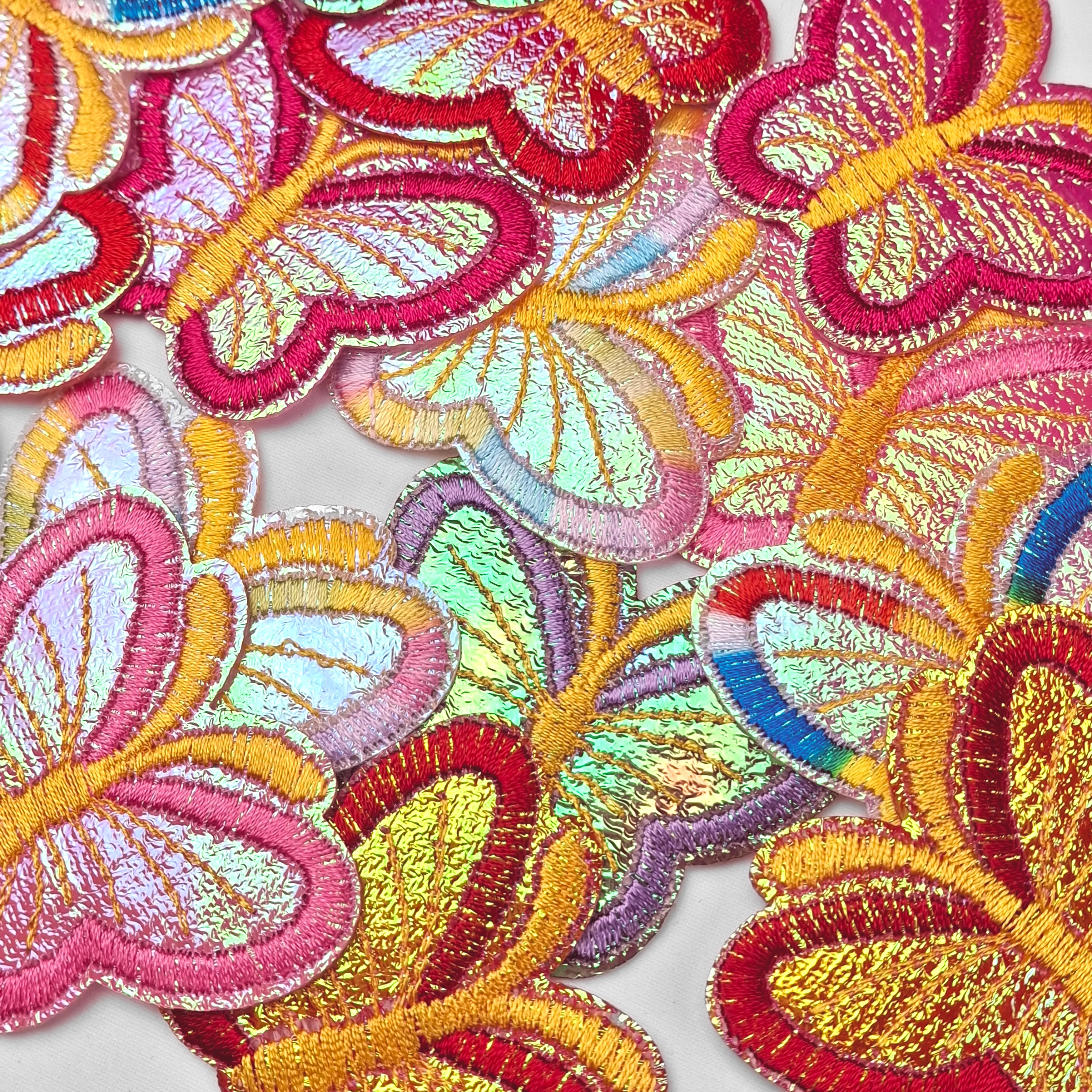 Vasalással rögzíthető irizáló rózsaszínes árnyalatú pillangó ruhacímke. Rugalmas, vízhatlan, selyem és hosszúszálú anyagon nem használható.