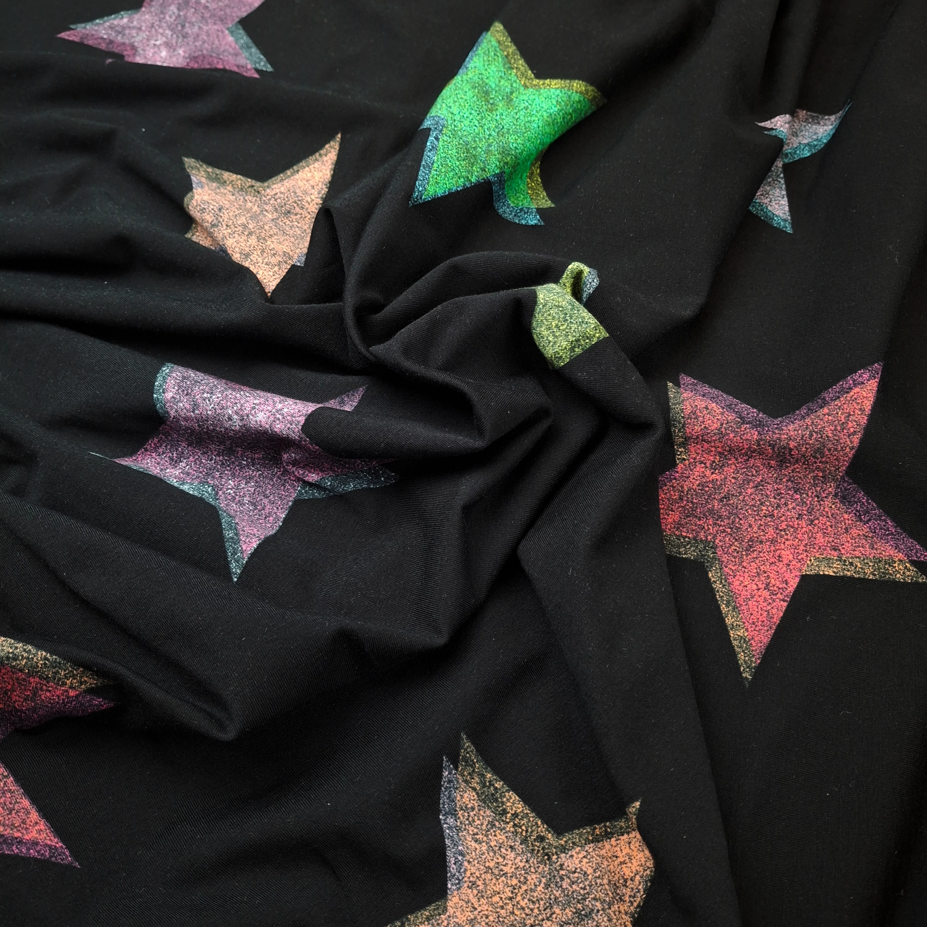 Viszkóz jersey méteráru fekete alapon nagyméretű csillag mintával, neonos árnyalatban. Lágy esésű, puha tapintású, mindkét irányban rugalmas vékony jersey anyag. A speciális kötési eljárásnak köszönhetően a jersey-ből készült ruhák kellemes viselet biztosítanak. Felhasználás előtt érdemes beavatni.