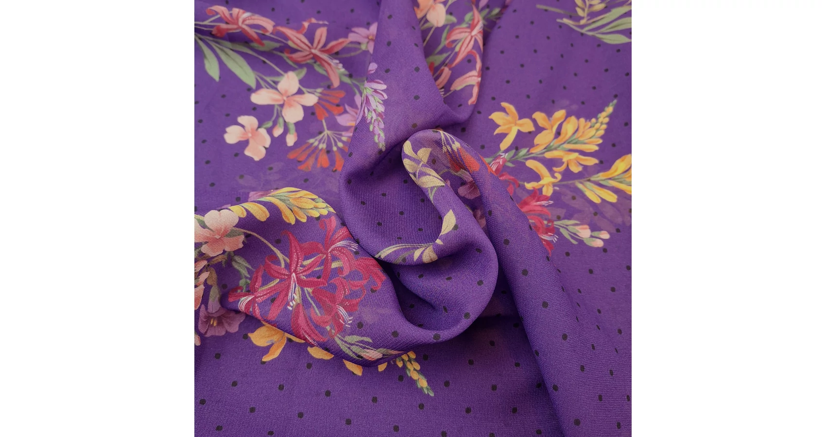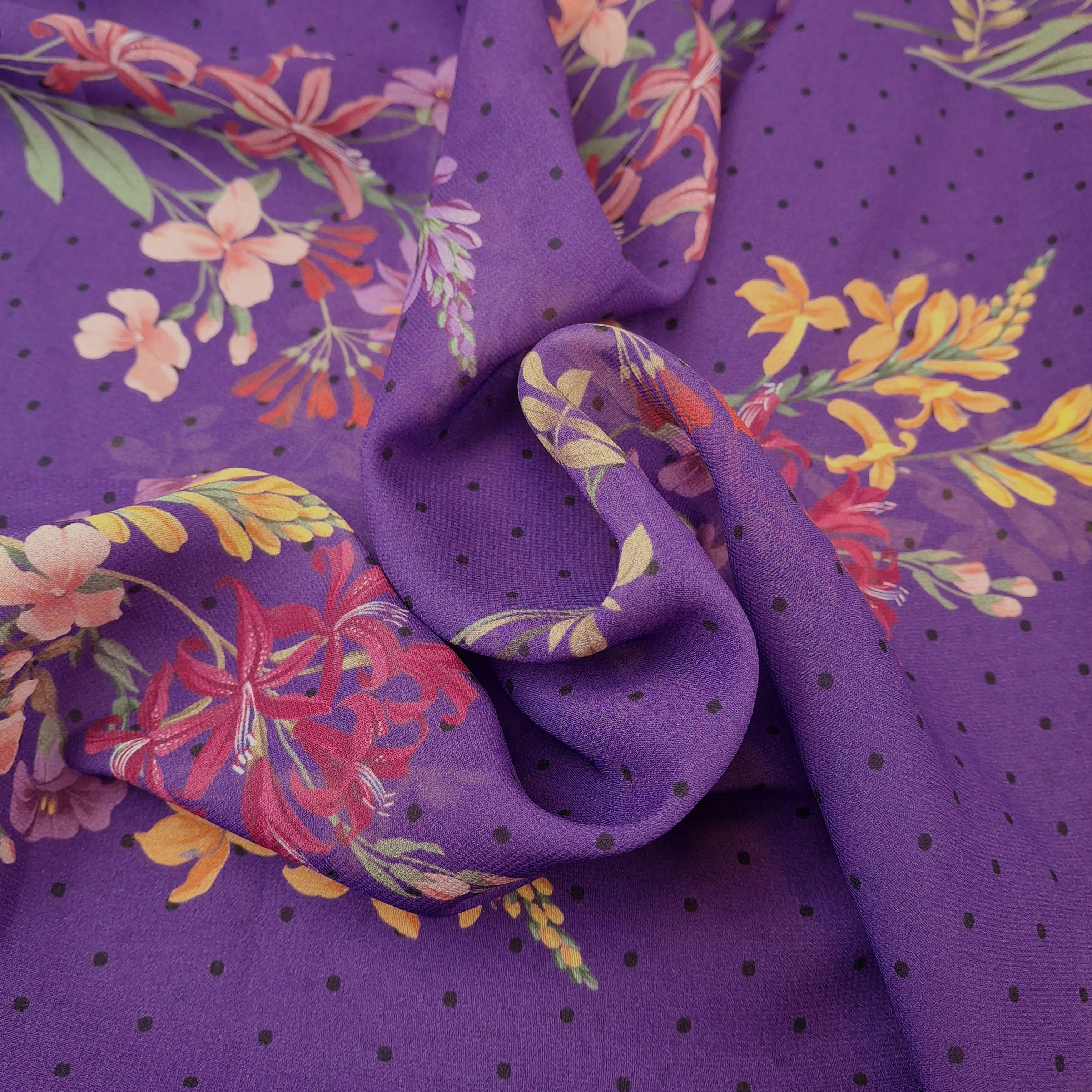 Viszkóz muszlin - Lila alapon pöttyös és virágos mintával