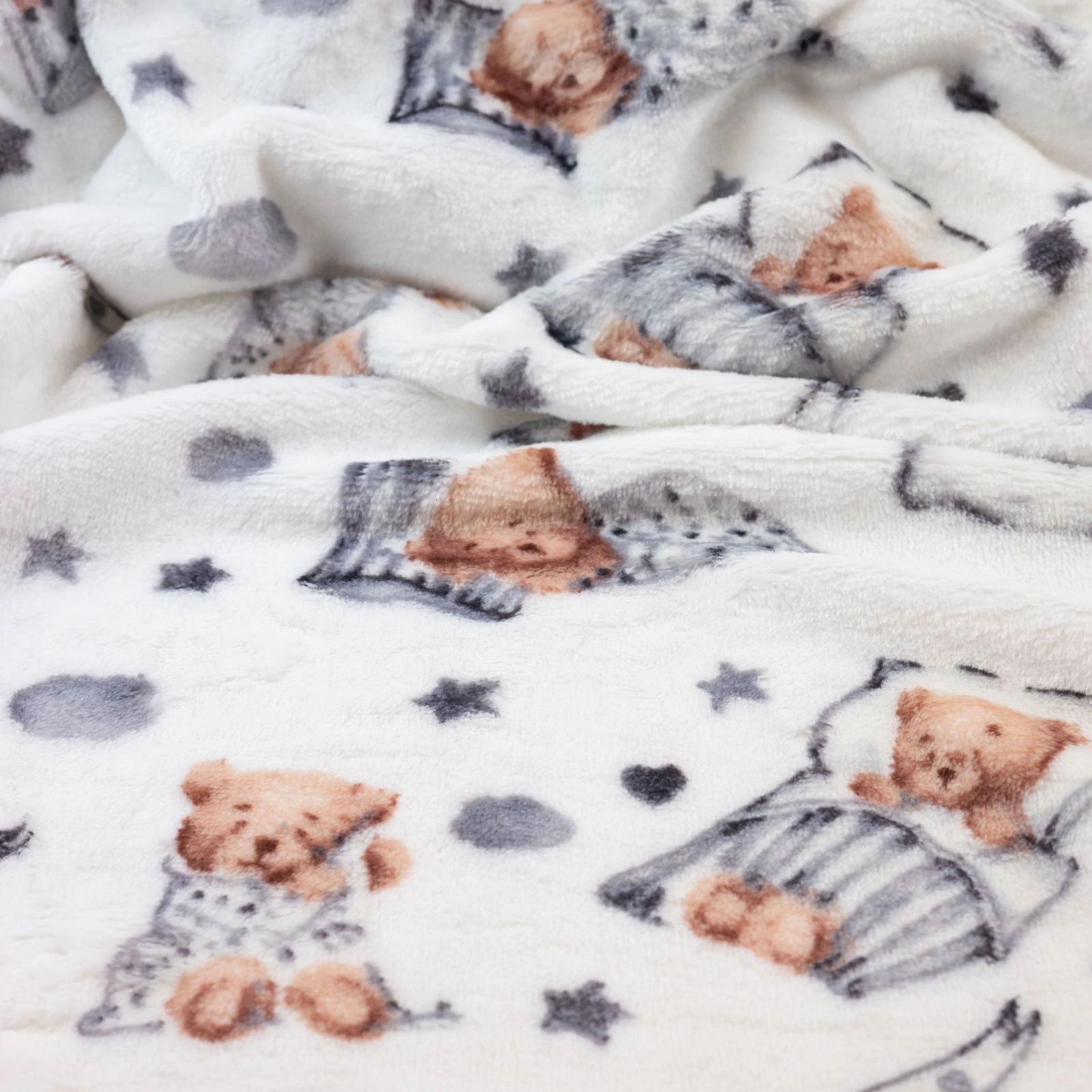 Wellsoft méteráru fehér színű alapon alvó maci mintával. A modern textilgyártási eljárásoknak köszönhetően a bőrrel érintkezve is kellemes érzést ad, igazán meleg, vastag, mégis könnyű téli textil. Vágáskor széle erősen szöszöl, de egy alapos kirázást követően akár szegni sem szükséges, mert széle nem foszlik.