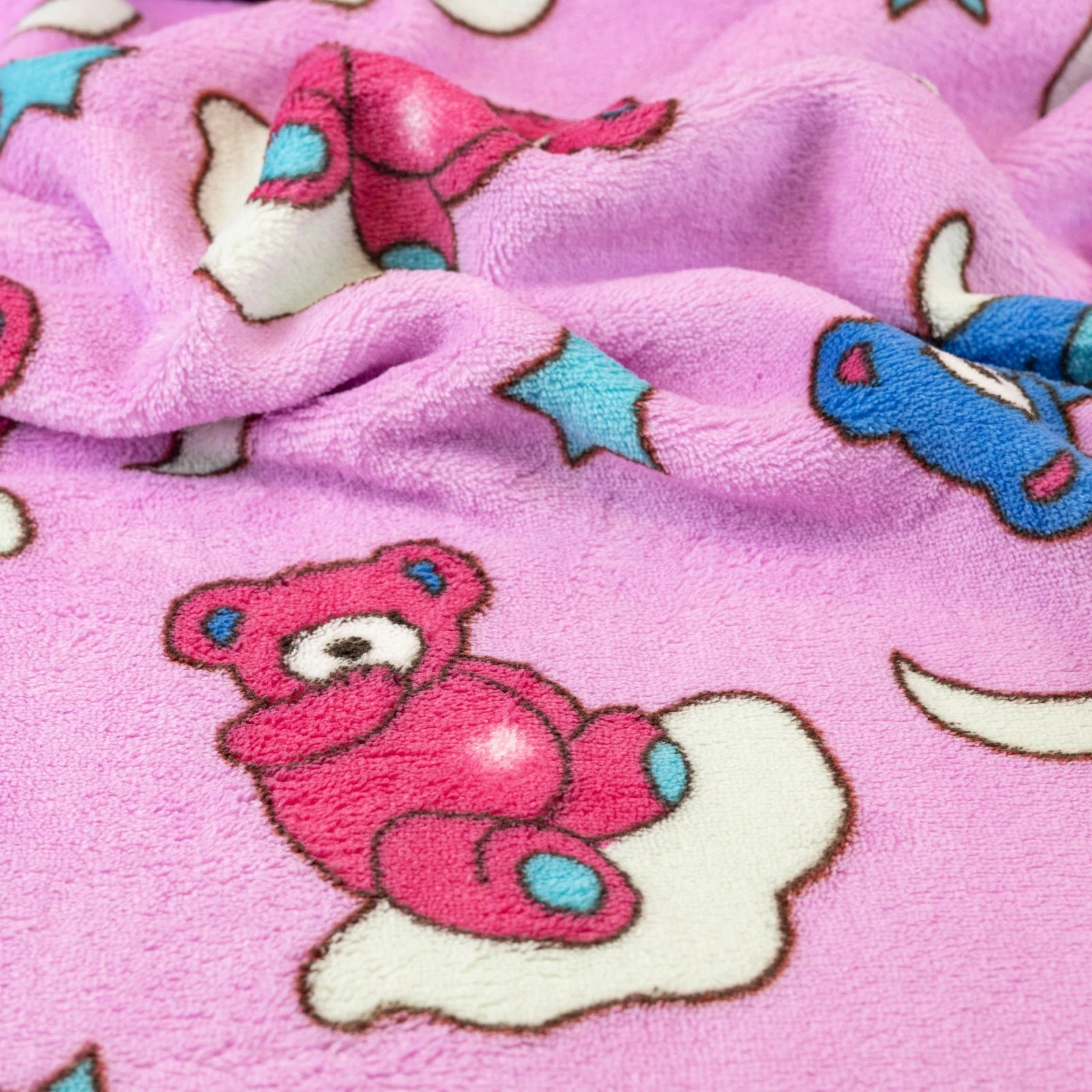 Wellsoft méteráru rózsaszín alapon kék és rózsaszín színű maci mintával. A modern textilgyártási eljárásoknak köszönhetően a bőrrel érintkezve is kellemes érzést ad, igazán meleg, vastag, mégis könnyű téli textil. Vágáskor széle erősen szöszöl, de egy alapos kirázást követően akár szegni sem szükséges, mert széle nem foszlik.