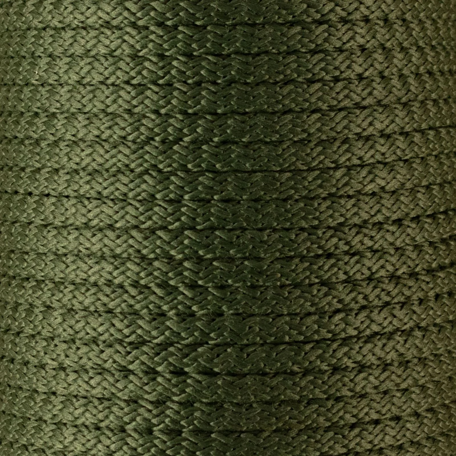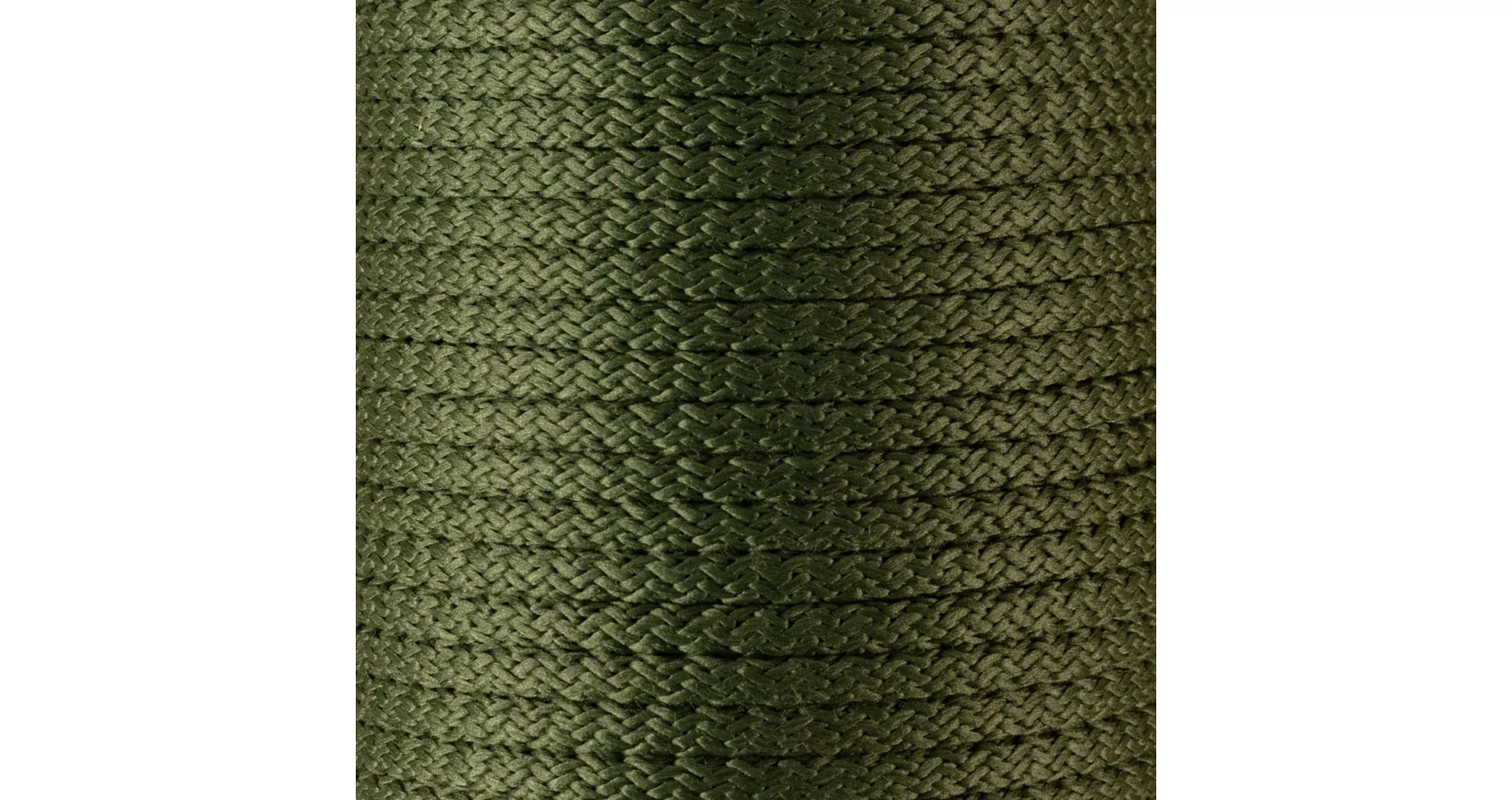 Poliészter gömb zsinór olajzöld színben. Kissé fényes, jól formázható, erős, nem elasztikus szövött zsinór. A belső szálnak köszönhetően formatartó, nem lapul le.