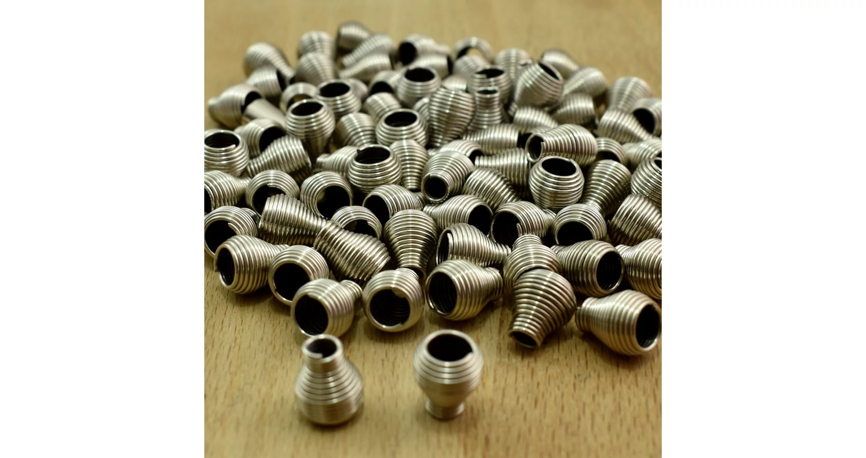 Csepp alakú spirálos fém végzáró ezüst színben. A zsinórt fűzzük át a végzárón és a nagyobb lyuk felőli végére kössünk akkora csomót, ami nem fér át a kisebbik lyukon.