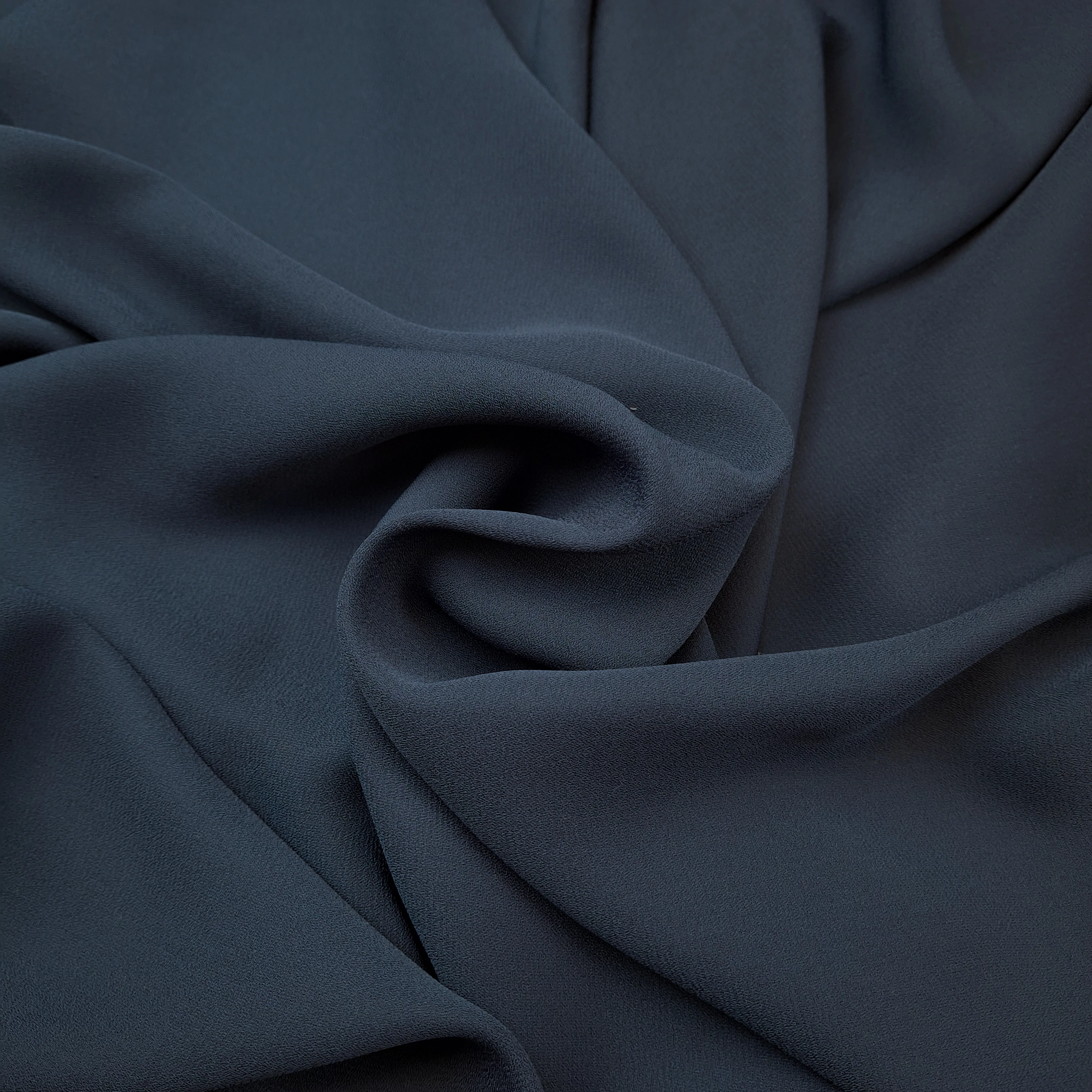 Zsorzsett selyem sötétkék színben. Texturált, zsorzsettes felületű, vékony, lágy esésű, hűvös érzetet biztosító nyári textil. Finom, lenge tapintású, igazi libbenős anyag. Mosását közepes hőfokon ajánljuk, felhasználás előtt beavatandó.